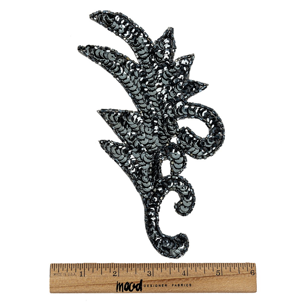 Young Cher would be thrilled with our Vintage Gunmetal Sequins and Beaded Foliage Appliqué. Featuring an abstractly designed foliage shape that is filled with neatly placed smokey opaque sequins and outlined by dark gunmetal beads, such a piece would be a great addition to an elegant neckline, a blazer sleeve, or to give a gown some more texture and flair.This piece measures 7.75 inches by 3.75 inches, is backed by mesh, and has a gauge of 0.95mm. Please note that dimensions may vary from piece to piece!