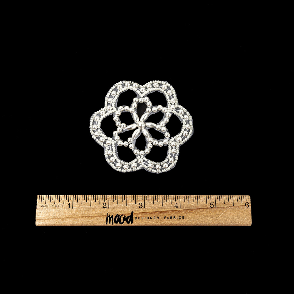 From weddings to sundresses, this Vintage Iridescent White and Pearl Beaded Floral Appliqué is perfect for any occasion. Measuring 3 inches in diameter, this appliqué features a central floral motif of one large faux pearl bead with six lozenge-shaped beads around it, plus two rows of arching petals composed of more faux pearl beads as well as iridescent white seed beads. Delicately ornate, add this floral piece to everything from wedding gowns and confirmation dresses to simple sundresses and everyday blouses.This patch has a gauge of 6.23mm, however the beaded patterns throughout may cause that measurement to vary.Please note: Due to the nature of its construction, the overall dimensions may vary slightly from piece to piece.