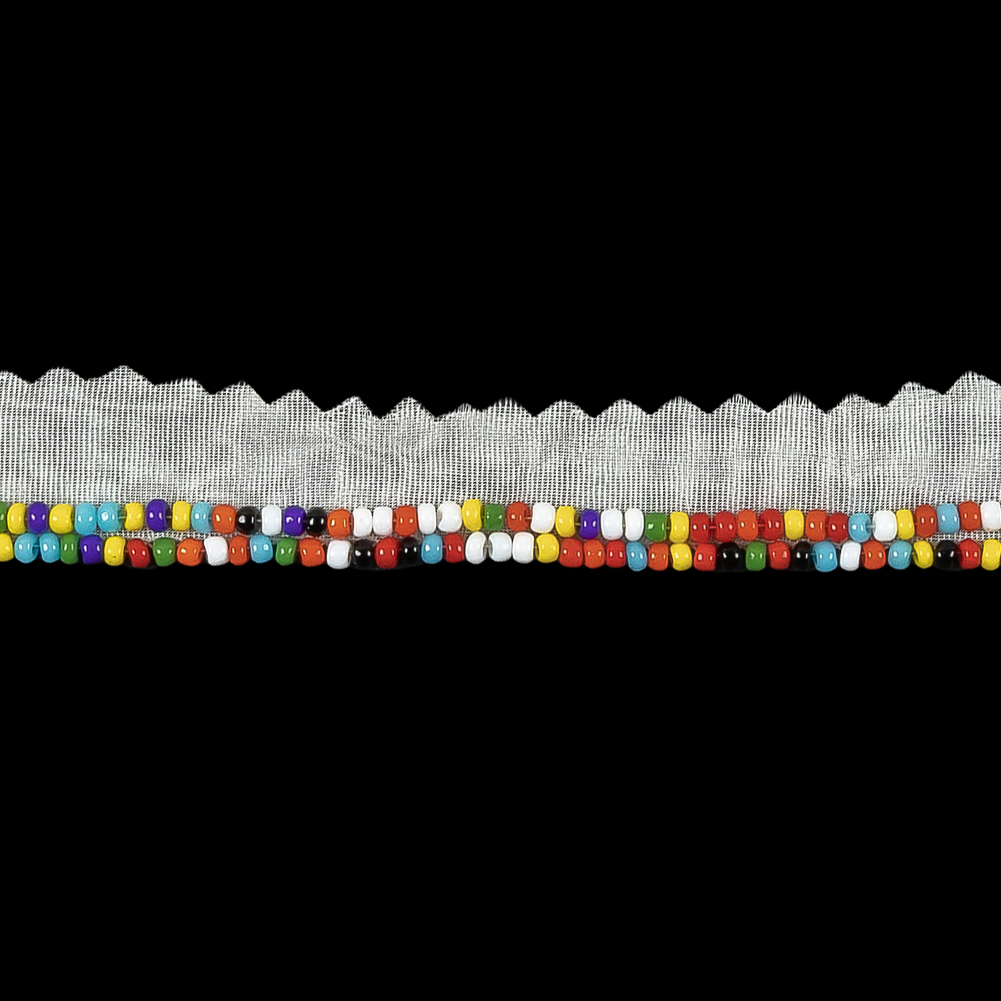 Embrace the whimsical charm of our Vintage Rainbow 2-Row Seed Beads on White Trimming for a fabulous, sweet garment! Here, two rows of multicolored seed beads are attached to the fold of a white mesh, itself pinked at the edge to prevent fraying.