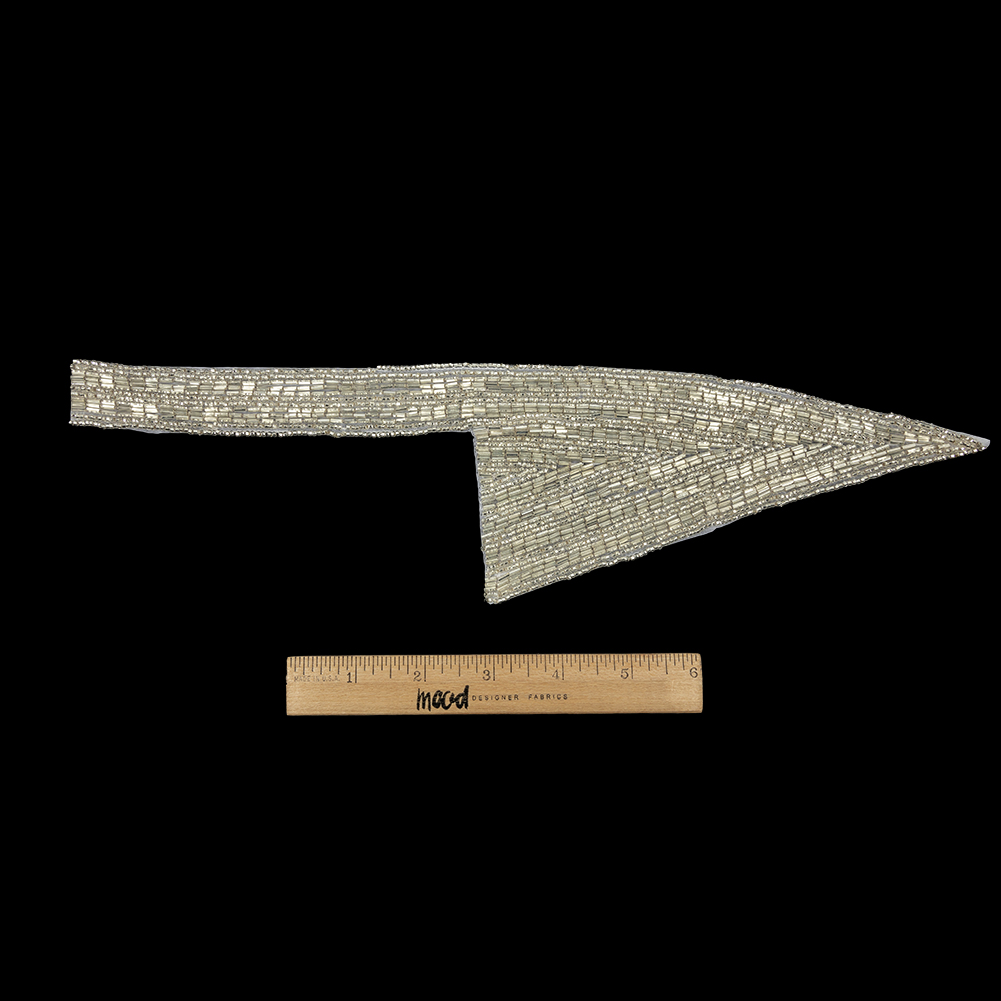 Watch your creations transform when using this beautiful Vintage Silver Geometric Glass Beaded Left Lapel Appliqué. A geometric shape composed of a triangle and rectangular extension from one corner forms a design reminiscent of a jacket lapel or half of an arrow, covered in silver beads. Measuring 13 inches by 3⅝ inches, it's perfect for decorating waistlines, collars, lapels, and side seams on pants or skirts. Please note: This appliqué is part of a perfect mirrored pair! See item 431683 for its counterpart.