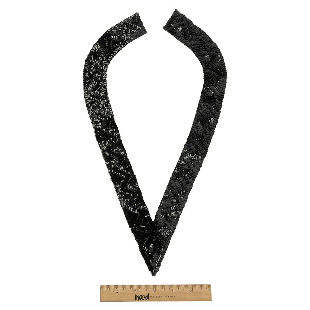 Create timeless treasures with this Vintage Silver Sequins and Beaded Pointy Collar Appliqué! Rows of faceted black sequins are interspersed with lines of seed beads in a zigzag pattern over this collar with a sharply pointed front.