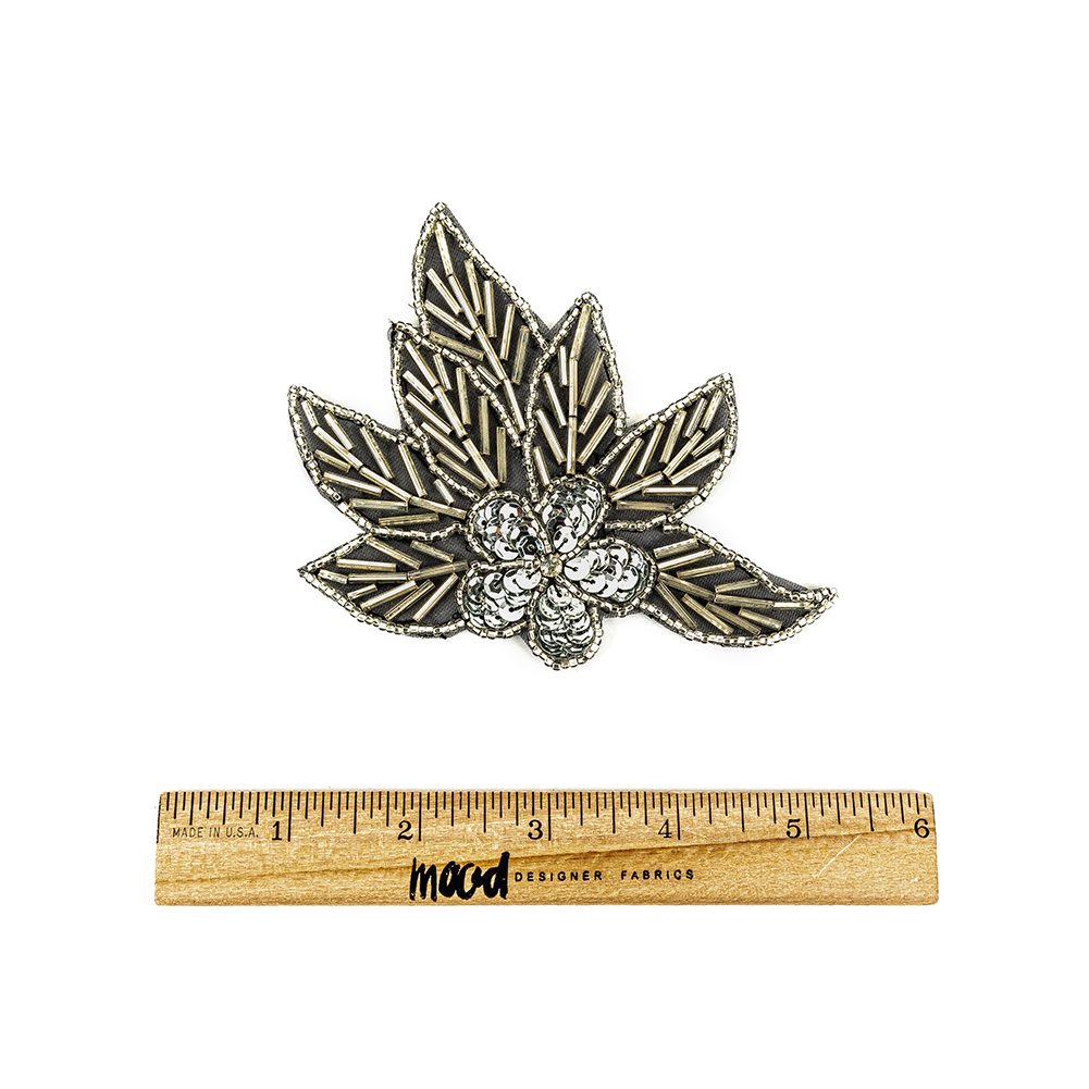 Our Vintage Silver Sequins and Silver-lined Bugle Beaded Floral Appliqué is a tasteful melange of bugle beads, seed beads, and sequins. Floral, leafy, and wintery, this would be fitting addition for a holiday dress, or swiftly create symmetry and use on both sides of a jacket or blazer.Backed by mesh, with a stiff construction, this accessory has a gauge of 2.3 mm.Please note: Due to the nature of its construction, the dimensions may vary slightly from piece to piece.
