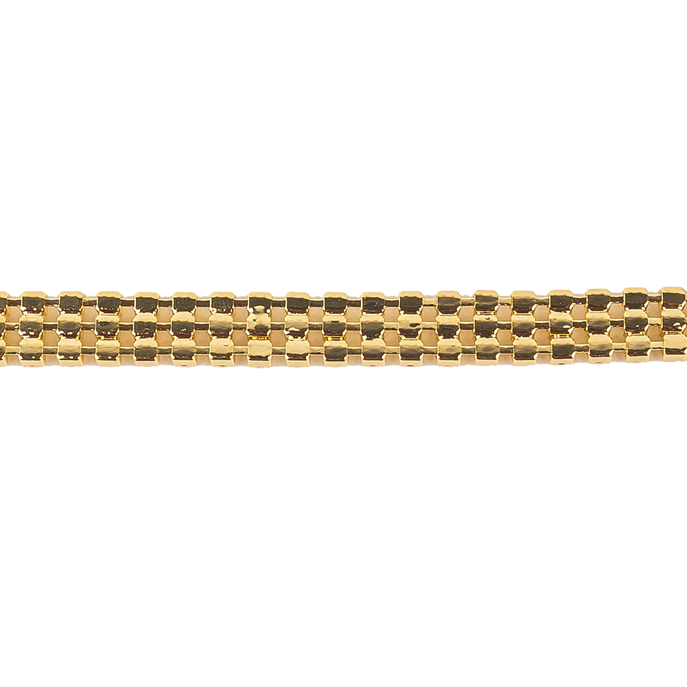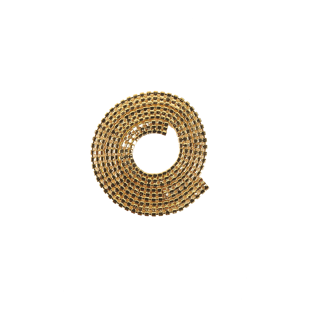Swanky, indeed, our Vintage Three Row Gold Tone Rhinestones on Metal Mesh Trimming is the perfect accent for a cocktail look. The mesh metal provides some flexibility to these weighty and glorious gold rhinestones—giving you, the designer, an opportunity to work this into jacket sleeves, lapels, handbags, and fedoras.This piece has a measurement of 0.375 inches with a gauge of 3.87mm.