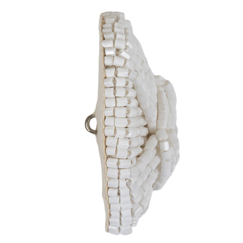 Our Vintage White Cross Seed Beaded Shank Back Button is just what you need to button up your wardrobe! Rows of shiny white seed beads form a convex “X” shape, with the flat backing featuring a metal shank and fabric covering.