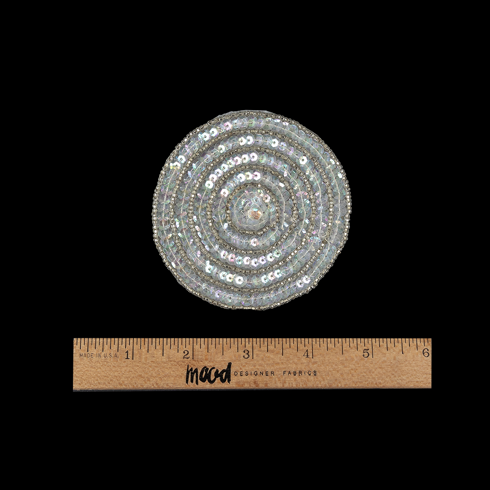 Who wouldn’t love a gorgeous garment updated with this Vintage White Iris Sequins and Silver Lined Seed Beaded Concentric Circles Appliqué? Alternating rows of clear iridescent sequins and silver seed beads spiral around a large, central iridescent bead.
