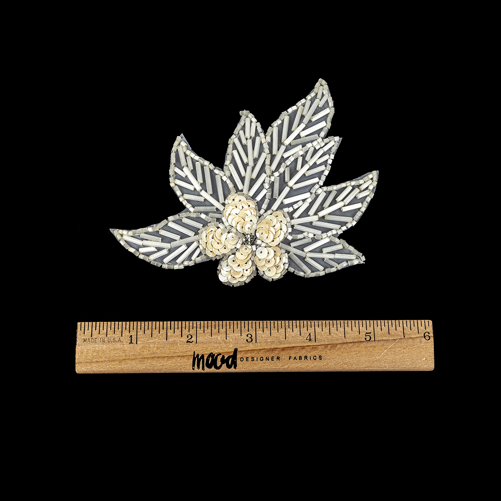Craft a crystalline charisma with this Vintage White Iris Sequins and Translucent White Bugle Beaded Floral Appliqué with Rhinestone Center! Floral, leafy, and wintery, this would be a fitting addition for a holiday dress, or swiftly create symmetry and use on both sides of a jacket or blazer.