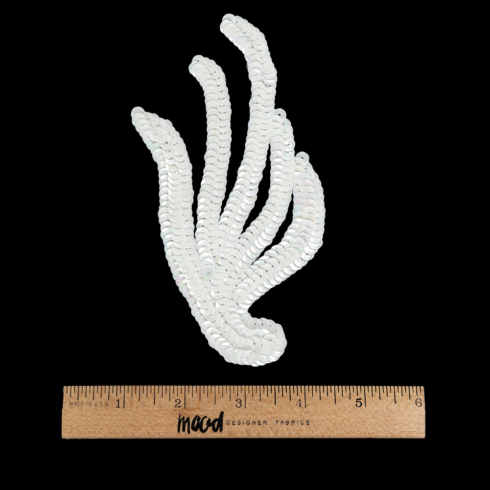 Inspired by the flora and fauna that surround us, this Vintage White Sequined Abstract Left Side Appliqué is quite the inspiring statement! Curved lines of white sequins mimic the natural shape of ferns and fronds, each glimmering in the light. Make a fashionable statement on evening gowns, lingerie, sleeves, and skirts.Please note: The dimensions of this piece measure 5¼ inches long by 3⅝ inches wide. WARNING: Cancer and Reproductive Harm - www.P65Warnings.ca.gov.