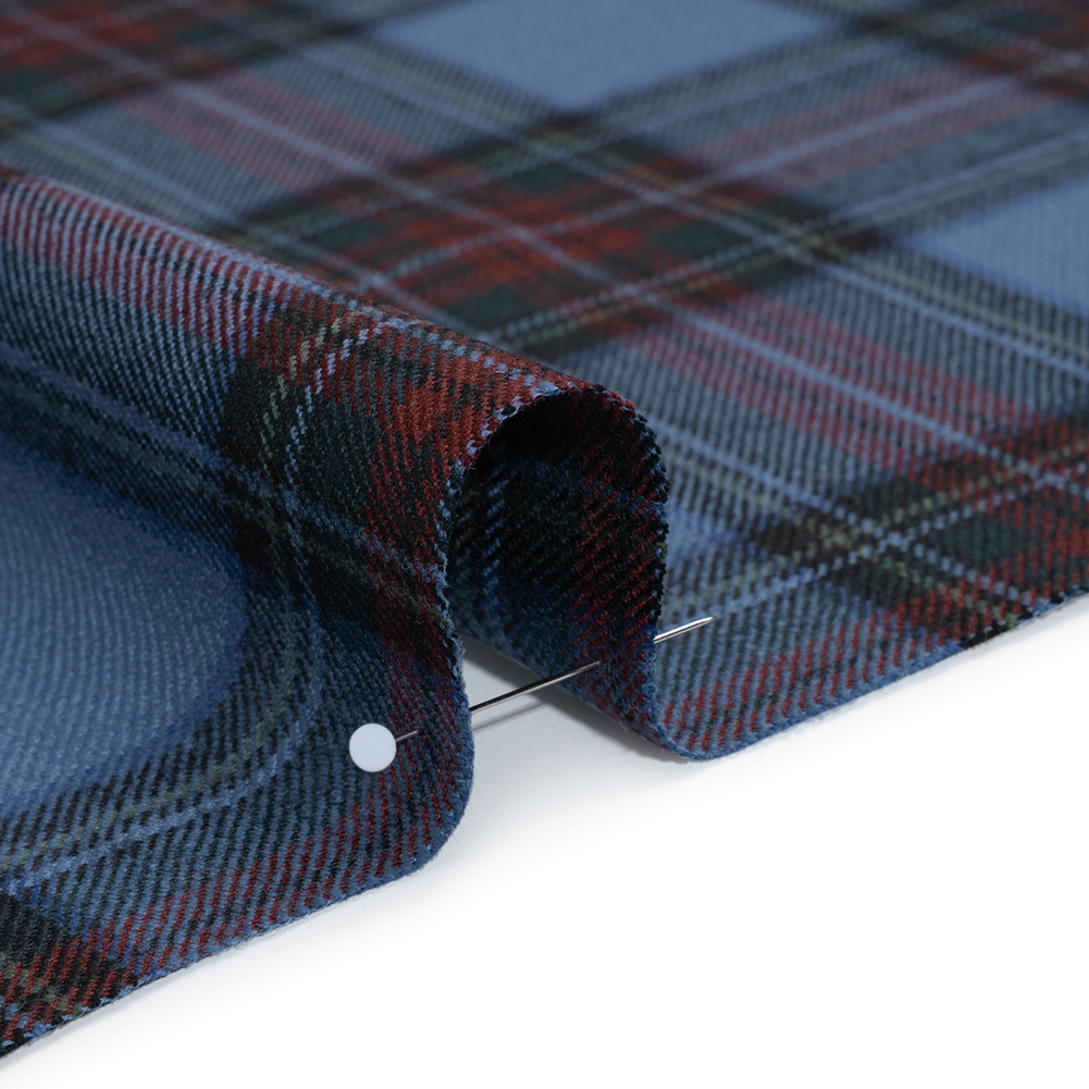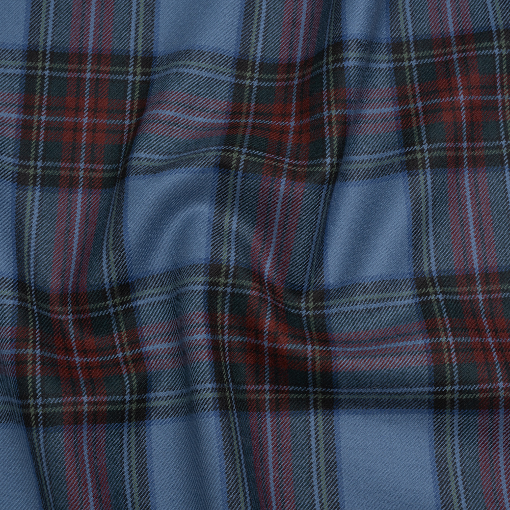 Crisp mornings call for cozy elegance—this Plaid Virgin Wool Twill offers a soft, smooth hand and fluid drape, perfect for autumn outings.Suggested Projects: Blazers, Dresses, Skirts, PantsContent: 100% Virgin WoolStretch: NoneOpacity: Mostly OpaqueDusty blue, dark red, forest green, and black wool threads intersect to form a deep, captivating plaid across this virgin wool twill, perfect for rich, timeless designs. Seamlessly move from workday to weekend with this wool twill’s soft, smooth hand and fluid drape, combining durability with effortless elegance. Perfect for structured or flowing designs, it’s ideal for tailored blazers, chic boat-neck dresses, pleated skirts, straight-leg trousers, and more. Mostly opaque, adding a lining enhances comfort, supports dimensional stability, and helps protect fine yarns from fraying at the seams.