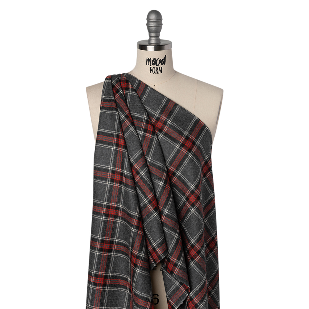 Cozy up with a steaming mug of tea and a good book in this Plaid Virgin Wool Twill—featuring a soft, smooth hand and fluid drape.Suggested Projects: Blazers, Dresses, Skirts, PantsContent: 100% Virgin WoolStretch: NoneOpacity: Mostly OpaqueHeathered gray, red, black, and white wool threads intersect in a timeless plaid, bringing cozy warmth and classic charm to this virgin wool twill. Seamlessly move from workday to weekend with this wool twill’s soft, smooth hand and fluid drape, combining durability with effortless elegance. Perfect for structured or flowing designs, it’s ideal for tailored blazers, chic boat-neck dresses, pleated skirts, straight-leg trousers, and more. Mostly opaque, adding a lining enhances comfort, supports dimensional stability, and helps protect fine yarns from fraying at the seams.