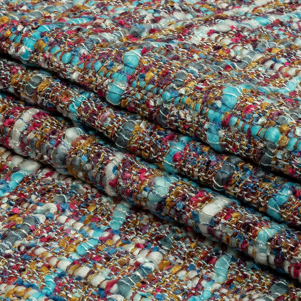 Shoot for the moon in this Sky, Bronze Mist, and Magenta Viscose and Acrylic Chenille Tweed! Featuring a fuzzy, tactile hand and malleable drape, it's perfect for prim and proper projects.Suggested Projects: Skirts, Dresses, Jackets, AccessoriesContent: 70% Viscose, 30% AcrylicStretch: NoneOpacity: Mostly OpaqueBrilliantly saturated and mottled threads of blue, gold, magenta and white with hints of coral and olive spread across the surface of this textile. A slightly fuzzy, tactile feel along with a malleable drape allows you to create Chanel-inspired skirts, blazers, or two-piece vintage suits, as well as dresses and jackets. Nearly opaque, a lining is only recommended for comfortability purposes and additional structure or stability when desired.