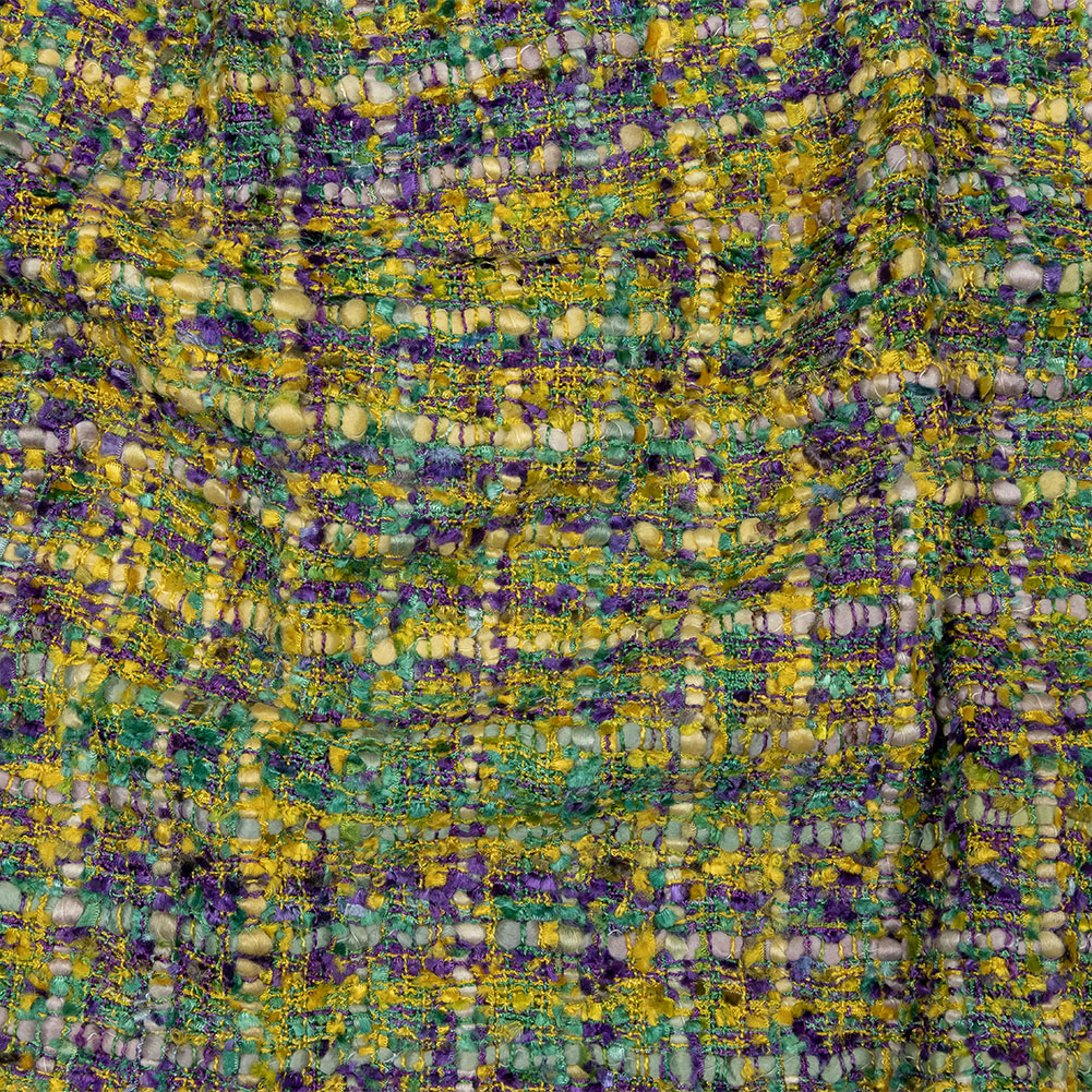 Feel festive in this Yellow, Dried Moss, and Purple Viscose and Acrylic Chenille Tweed! Featuring a fuzzy, tactile hand and malleable drape, it's perfect for prim and proper projects.Suggested Projects: Skirts, Dresses, Jackets, AccessoriesContent: 70% Viscose, 30% AcrylicStretch: NoneOpacity: Mostly OpaqueMottled shades of green, blue, purple, and yellow will have you packing your bags for the streets of New Orleans. A slightly fuzzy, tactile feel along with a malleable drape allows you to create Chanel-inspired skirts, blazers, or two-piece vintage suits, as well as dresses and jackets. Nearly opaque, a lining is only recommended for comfortability purposes and additional structure or stability when desired.