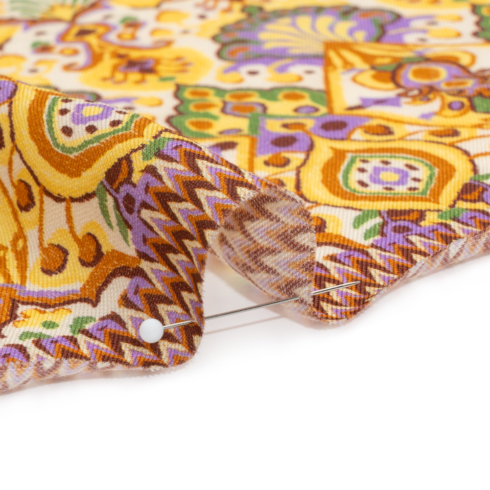 Viscose and Linen Twill Print - Yellow and Orange Stylized Flowers and Chevrons - Mood Exclusive Fashion Floral
