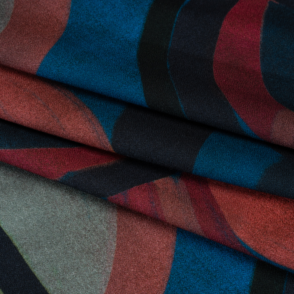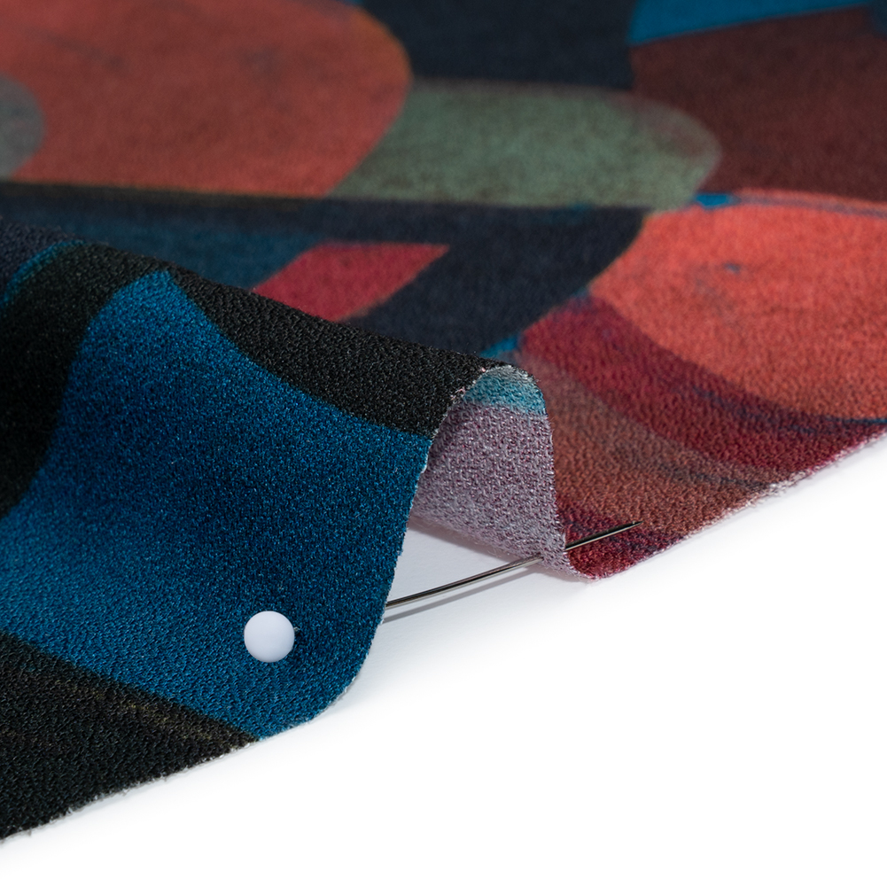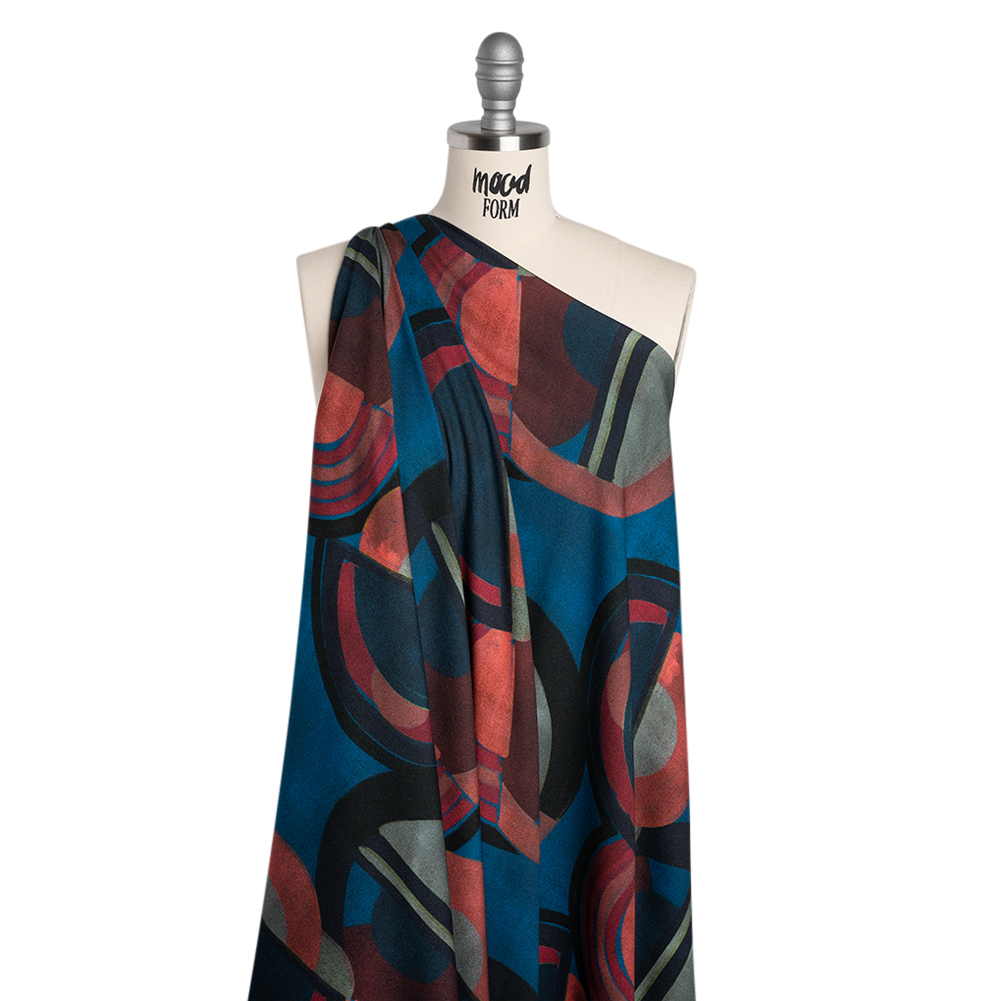 You’ll be glad to have found this Mood Exclusive Berry Red Orphic Orbits Viscose Crepe in your orbit—featuring a smooth, slightly grainy hand and fluid drape.Suggested Projects: Dresses, Skirts, Shirts, ShortsContent: 100% ViscoseStretch: NoneOpacity: TranslucentInspired by the ephemeral art style "Orphism," soft, flowing geometrics made up of circles and arcs swirl across the surface of this viscose crepe. Painted in rich tones of berry red, deep blue, and navy, the design evokes a sense of movement and harmony, as if each shape is in constant motion, dancing through a dynamic, yet calm, visual rhythm. Crepe fabrics are well-known for their signature textured surfaces, made up of tightly twisted yarns. With a grainy yet altogether smoother hand than the usual crepe and a fluid drape, this fabric easily inspires dreamy, flowing silhouettes. Design with bouncy garments and simple day-to-night transitions in mind, crafting billowing blouses, relaxed dresses, pleated skirts, breezy button-ups and more! Translucent, considering a lining for complete opacity and additional structure.