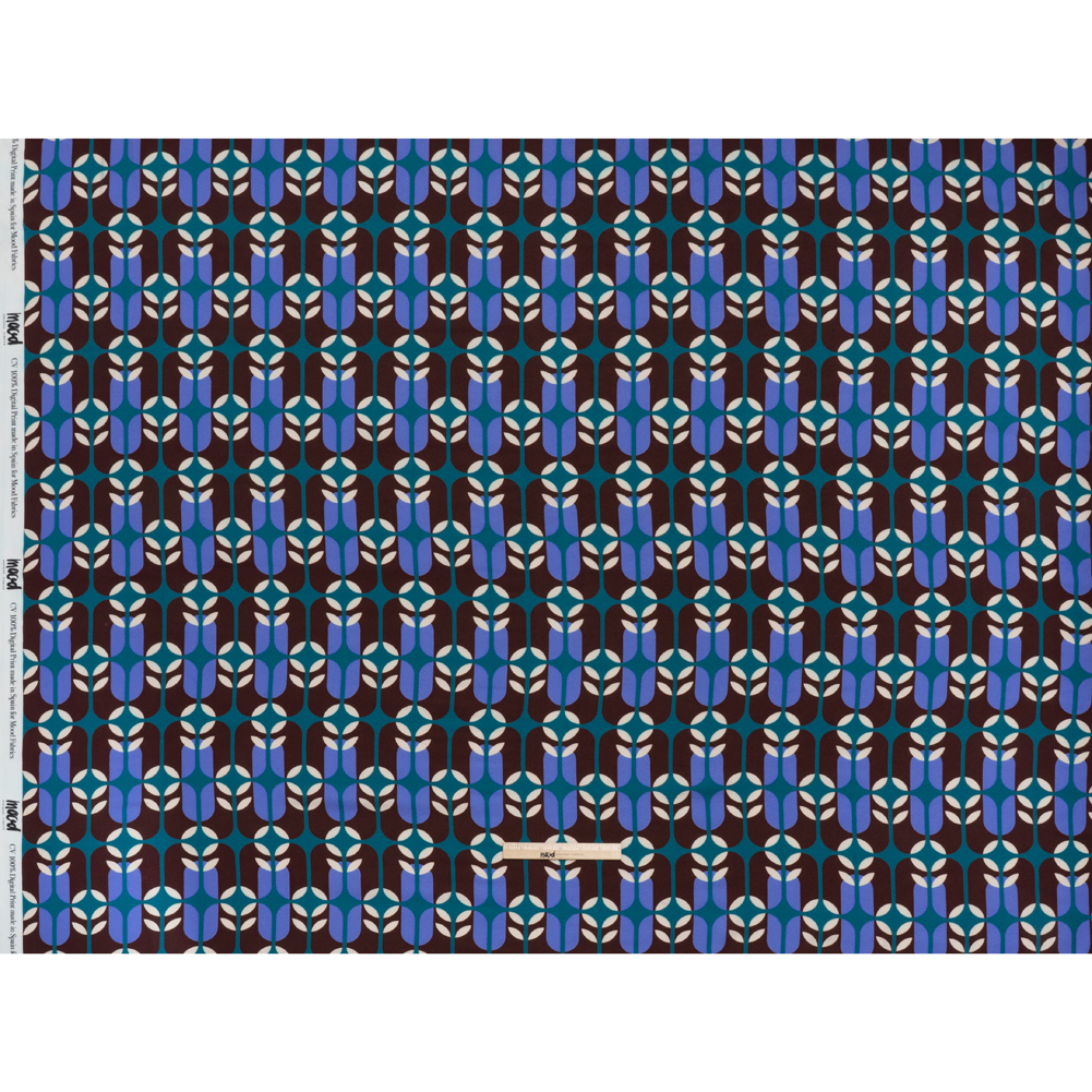 Viscose Crepe – Chocolate Brown, Blue and Teal Retro Geometric – Mood Exclusive Mod Logic Print