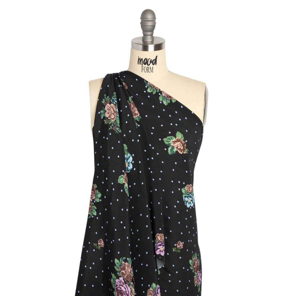 Playful and dainty, our Mood Exclusive Bring on Beauty Viscose Crepe displays flowers and light purple polka dots against a black background.