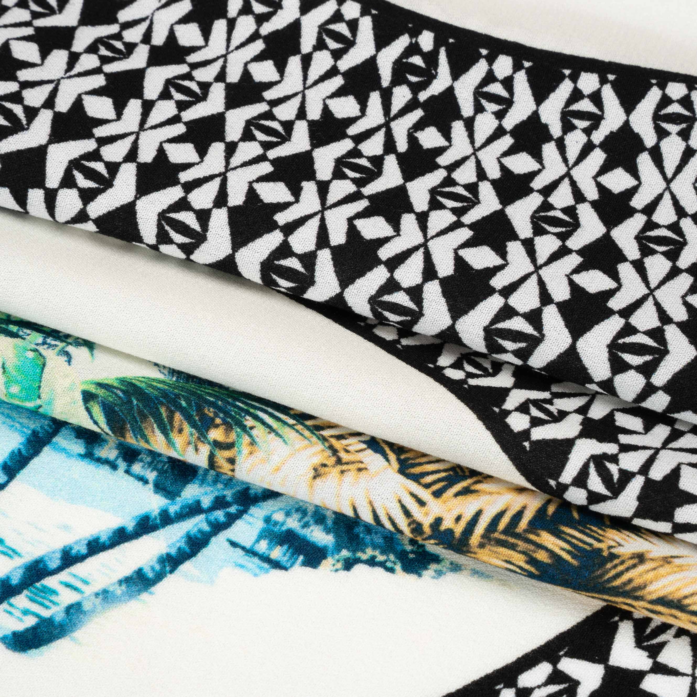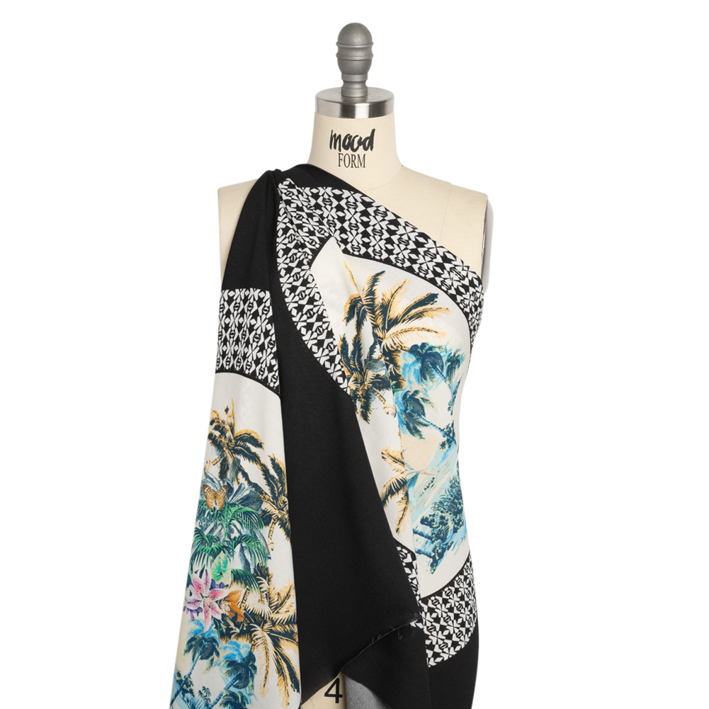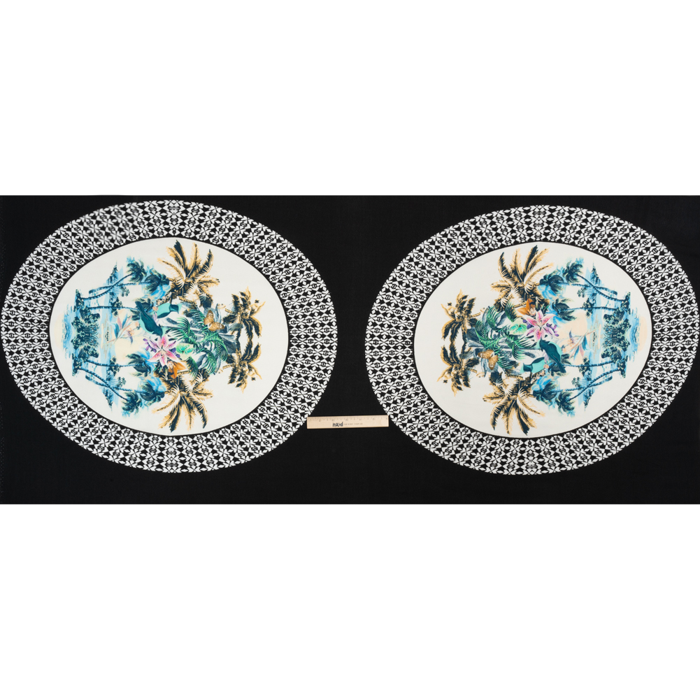 Viscose Crepe Print - Black, White and Blue Palm Tree Circles - Mood Exclusive Picturesque Porthole