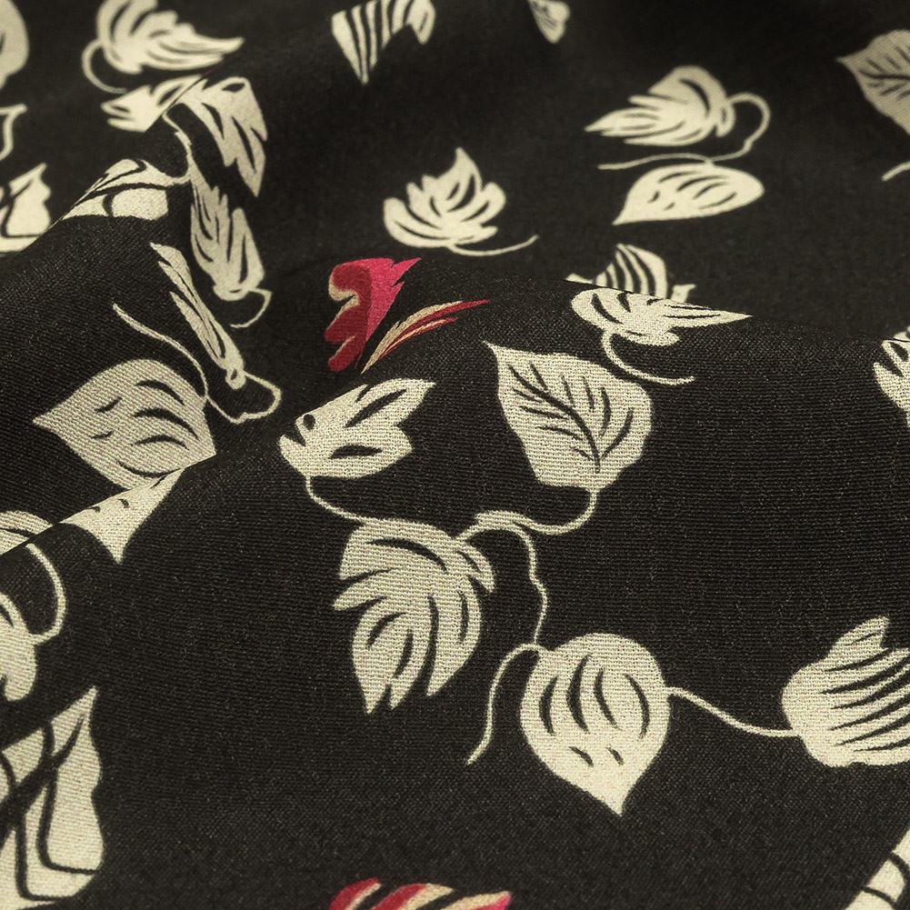 Stay just a moment longer as the night falls, waiting for a leaf to pass along a gust of wind, looking glamorous in our Mood Exclusive Lingering Leaves Viscose Crepe! Ghostly white leaves fall along a black ground, occasionally outlined in bright pink for extra energetic style.