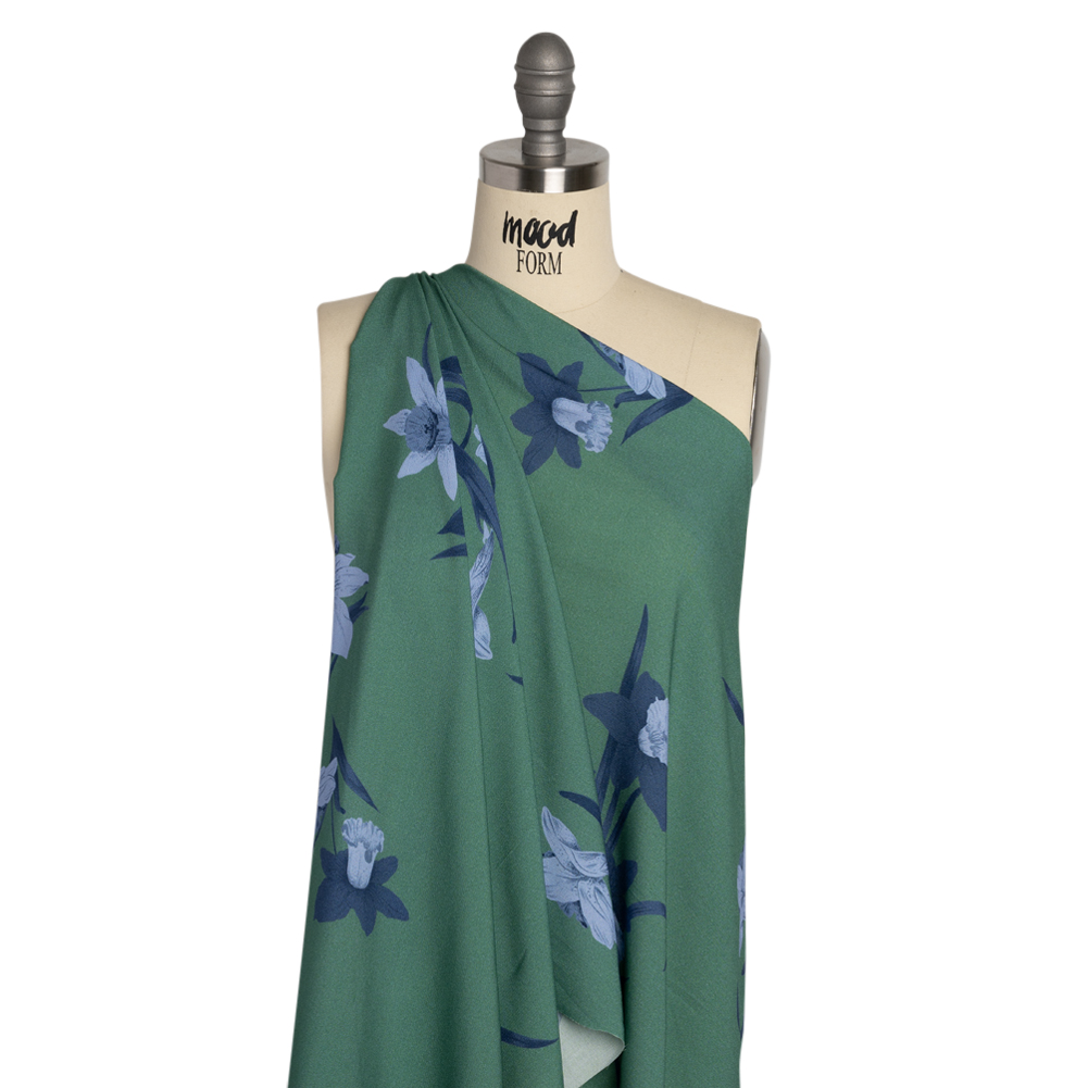 Your fairytale begins with our Mood Exclusive Green April Ever After Viscose Crepe, emitting a romance as ripe as the fresh blooms of spring. Midnight blue and periwinkle bouquets of daffodils rest against a dark sage background, waiting to be gifted to your Prince or Princess Charming. From everyday blouses to bridesmaid dresses, crepe’s grainy hand and rippling drape are versatile and comfortable, creating a fabric that can walk you down a grocery aisle or the aisle. It is beautiful as an overlay, with a lining, or as a stand-alone sheer garment.