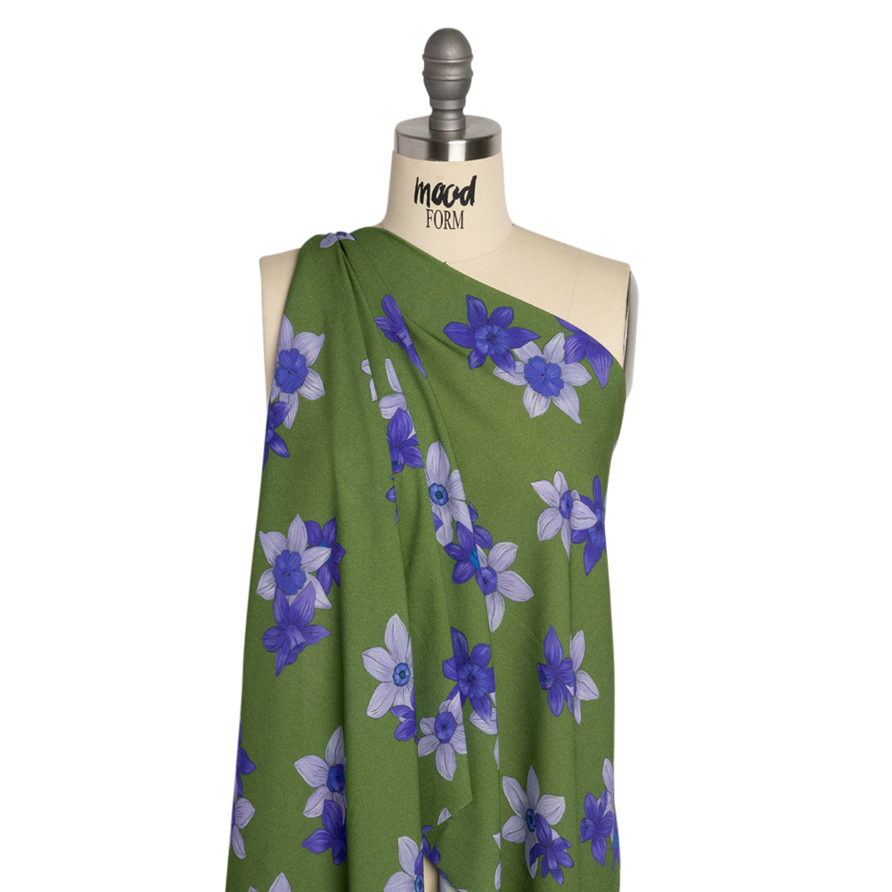 Feel fresh in our Mood Exclusive Kelly Baby Bunches Viscose Crepe. Daffodils and crocuses flash their beauty in small bursts against a kelly green background, colored in saturated indigo and pale periwinkle. From everyday blouses to bridesmaid dresses, crepe’s grainy hand and rippling drape are versatile and comfortable, creating a fabric that can walk you down a grocery aisle or the aisle. It is beautiful as an overlay, with a lining, or as a stand-alone sheer garment.