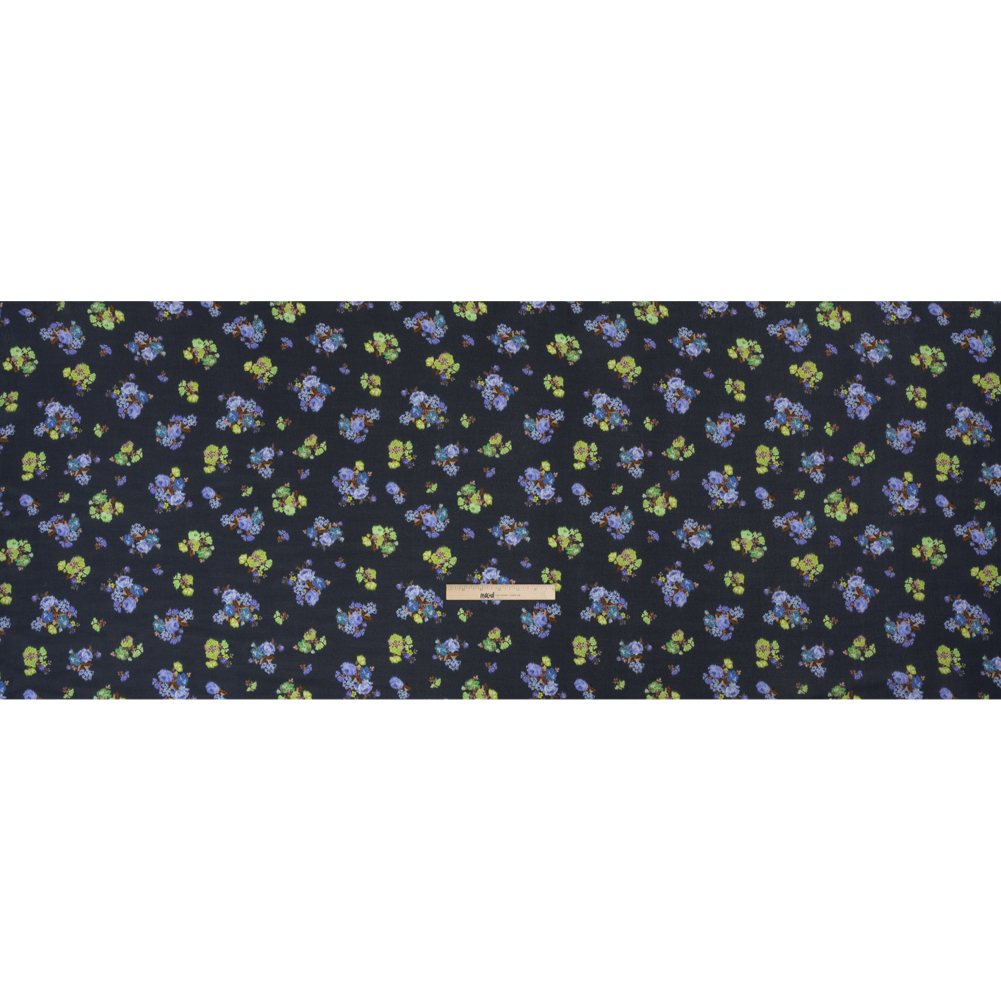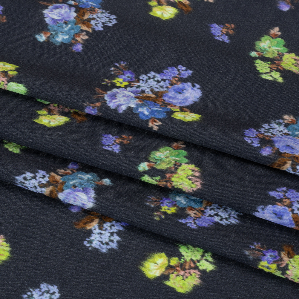 In the wake of romance, all sights are hazy with love; our Mood Exclusive Navy Rosy Visions Viscose Crepe displays blurry bunches of vibrant roses against a navy background.