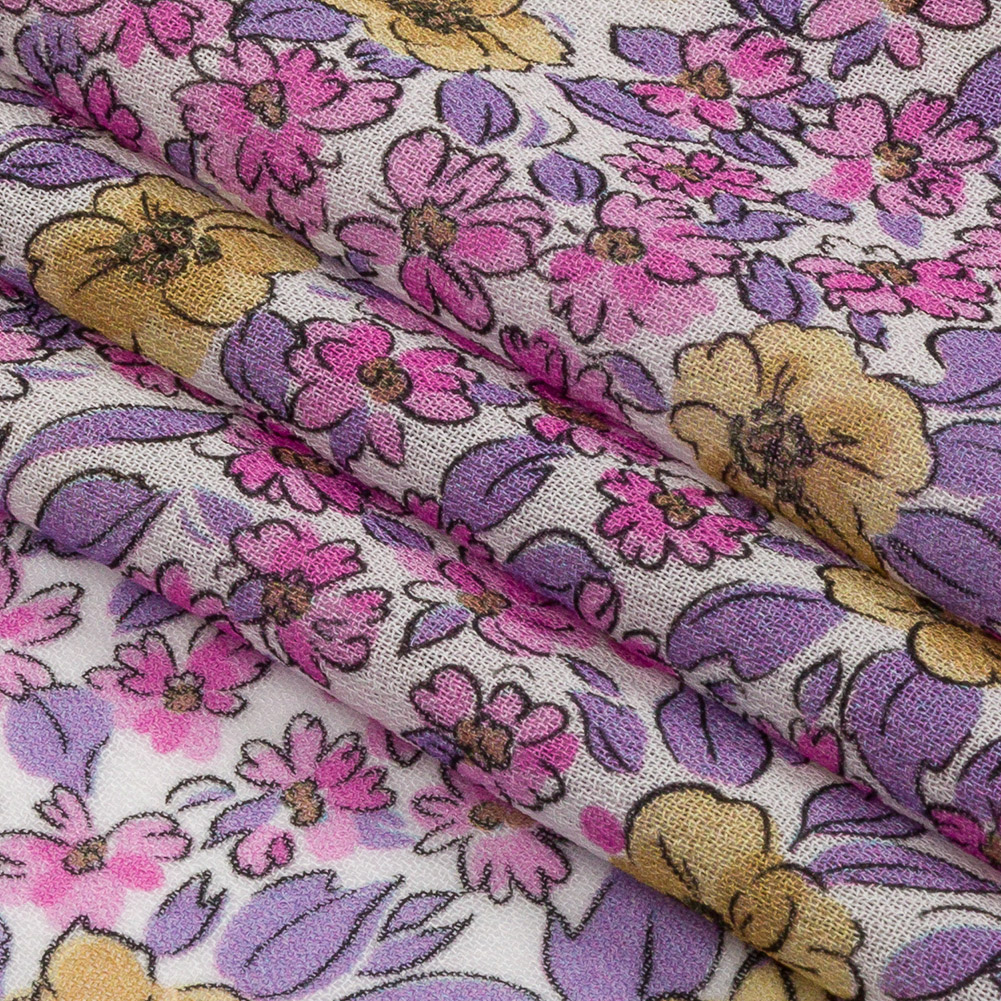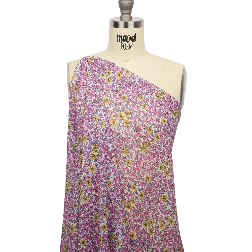 Inspired by the brief but beautiful life of flowers, our Mood Exclusive Large Pink Springtime Saunter Viscose Georgette evokes wistful memories of the first smells of spring. A wild growth of large flowers, purple and yellow, blooms from the snowy ground, joyously showcasing the season’s first signs of growth. This sheer fabric presents a grainy hand and an effortlessly fluid drape. Wear the summer breeze as an accessory as you don airy pleated skirts and lightweight maxi dresses for casual brunches, formal weddings, and everything in between.Explore Mood’s flower shop: The Secret Garden Collection is an aromatic assembly of bouquets and fields and gardens, sprawling with life and buzzing with color. Get picking!