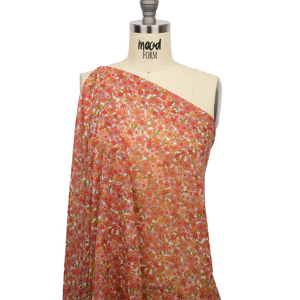 The power of flowers is timeless. Evoke feelings of peace, balance, and vitality with our Mood Exclusive Orange Strawberry Fields Viscose Georgette; a groovy arrangement of orange and pink florals. This sheer fabric presents a grainy hand and an effortlessly fluid drape. Wear the summer breeze as an accessory as you don airy pleated skirts and lightweight maxi dresses for casual brunches, formal weddings, and everything in between.Explore Mood’s flower shop: The Secret Garden Collection is an aromatic assembly of bouquets and fields and gardens, sprawling with life and buzzing with color. Get picking!