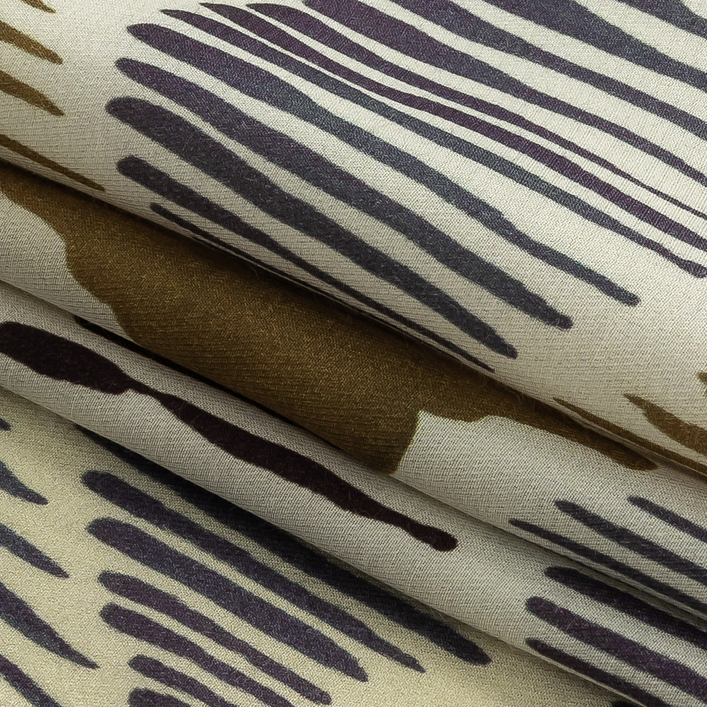 You'll feel good about our Mood Exclusive Navy and Olive Texture Transverse Viscose Twill! Steel blue, navy, and olive green stripes, spots, and splotches spread across an off-white ground, a tantalizing intersection of textures and patterns. This silken-feeling twill has a supple, fluid drape and a slight sheen on its surface. Medium weight and without stretch, craft fluttering skirts, draping blouses, or wide-legged pants. Mostly opaque, using a lining is a matter of personal preference, but may be desirable to add structure in some applications.