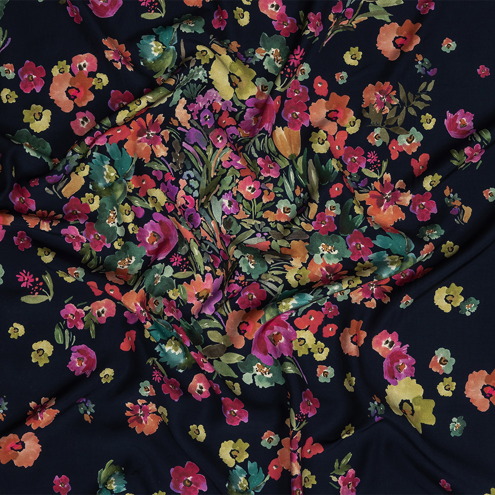 The flowers are looking fine on our Mood Exclusive Navy Sunny Day Best Viscose Twill! Brilliant pink, peach, and teal watercolor flowers and leaves dress up a dark blue background, like petals reaching for summer sunshine.