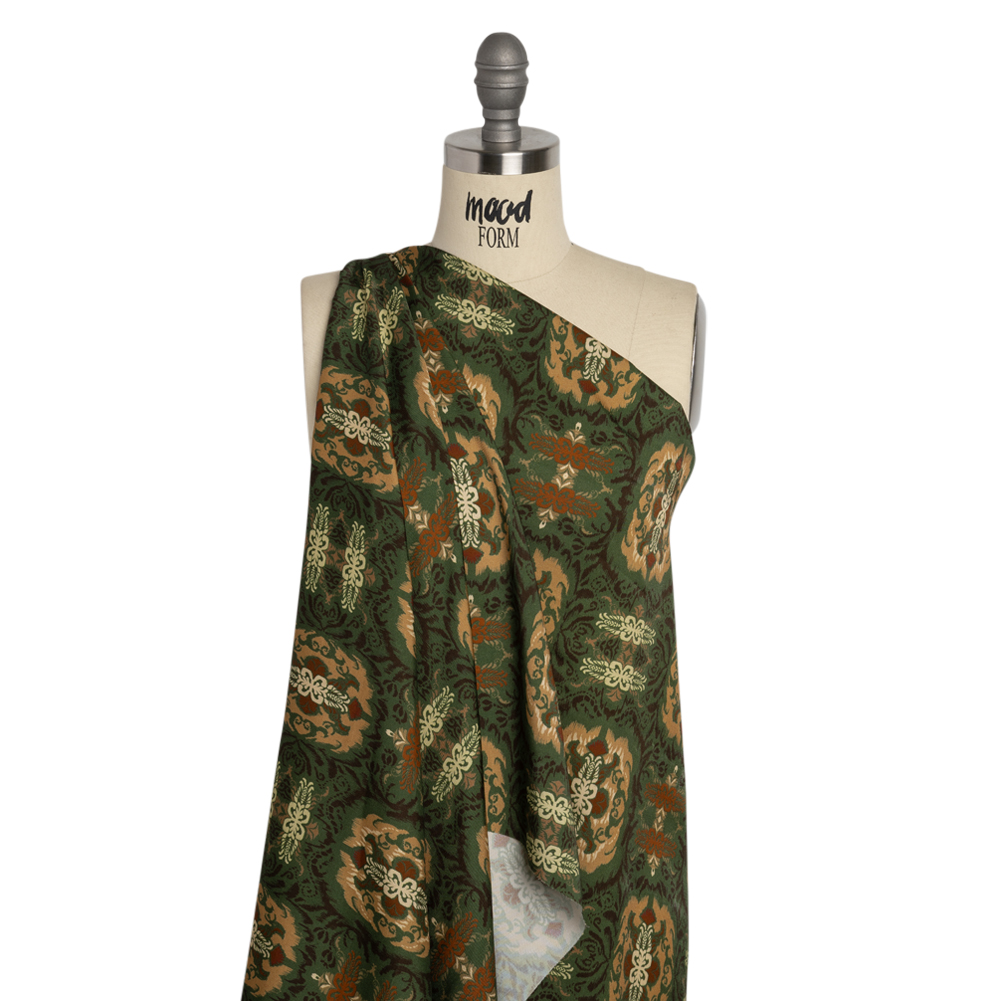 Viscose Twill Print – Green and Tan Leafy Ikat Medallions – Mood Exclusive Acacia Arena