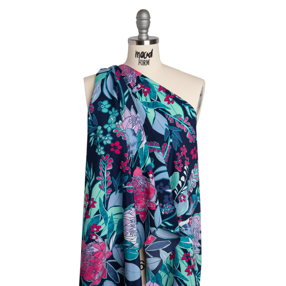 Believe in the magic of a new beginning, and this Navy Blue, Mint Green and Magenta Pink Floral Washed Polyester Woven—featuring a soft, smooth hand and fluid drape.Suggested Projects: Shirts, Blouses, Skirts, DressesContent: 100% PolyesterStretch: NoneOpacity: Mostly OpaqueMint green, magenta pink, light blue, and purple florals are painted across a navy blue background—in a gouache-like effect. This washed woven weaves fairytales in your closet with its fluid drape and captivatingly soft and smooth hand. Without stretch, these midnight blooms inspire crisp button-up shirts, everyday blouses, midi skirts, and collared tea dresses—for following Alice down the rabbithole. Mostly opaque, a lining can be used to increase opacity and structure.