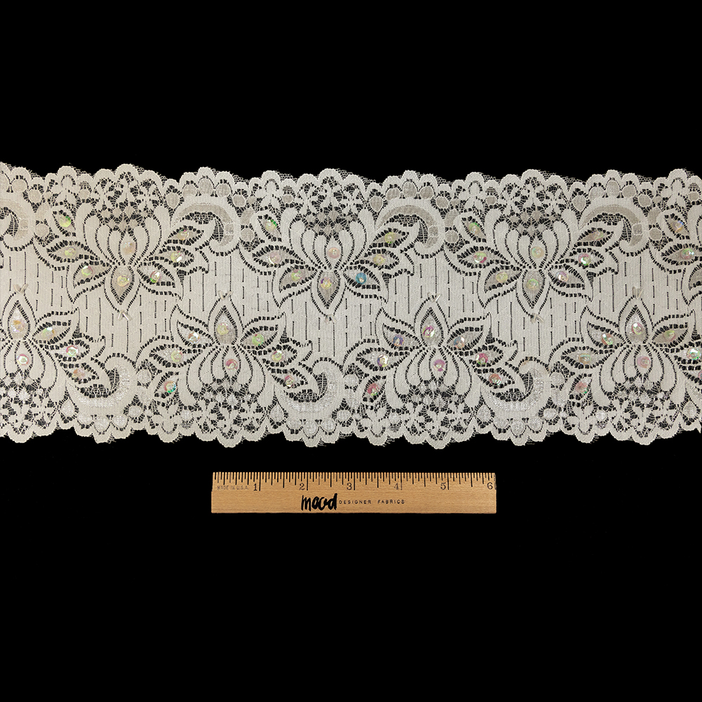 White and Iridescent Beaded and Sequined Floral Stretch Lace Trim – 6″