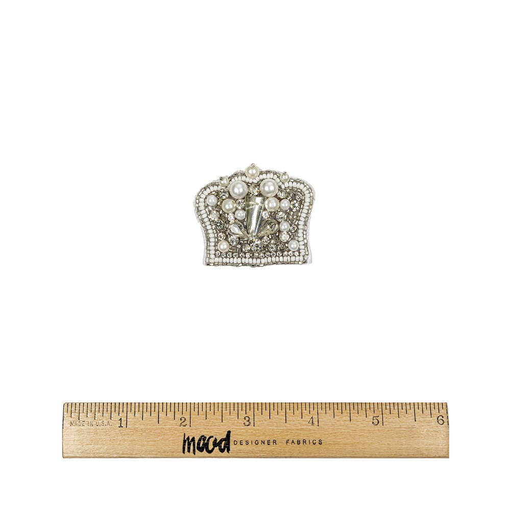 Elevate your next project with this White and Silver Pearled Crown Rhinestone and Glass Beaded Appliqué! Measuring 1.625 inches by 2 inches overall, this appliqué takes the shape of a regal crown, composed of crystal rhinestones, pearl beads, and white and silver-lined glass beads.Individually hand-beaded, these appliqués are truly one-of-a-kind, perfect for adding a couture touch to every garment you make. Dress up a denim jacket or a hat, decorate the lapels of a shirt or blazer, or apply a glittering accent to gowns and special occasion dresses—every appliqué provides a glistening multitude of possibilities.Please Note: These couture appliqués arrive in a sealed package adhered to a paper backing card; when removing, it is possible that a bead of glue may remain on the reverse. The glue is best removed with an X-Acto or utility knife. Keeping the blade parallel to the back of the appliqué, simply cut the adhesive bead off; if any residual glue or paper remains, lightly scrape the blade back and forth over the area. A fresh blade is recommended. Always point the blade away from your body and hands while cutting or scraping.