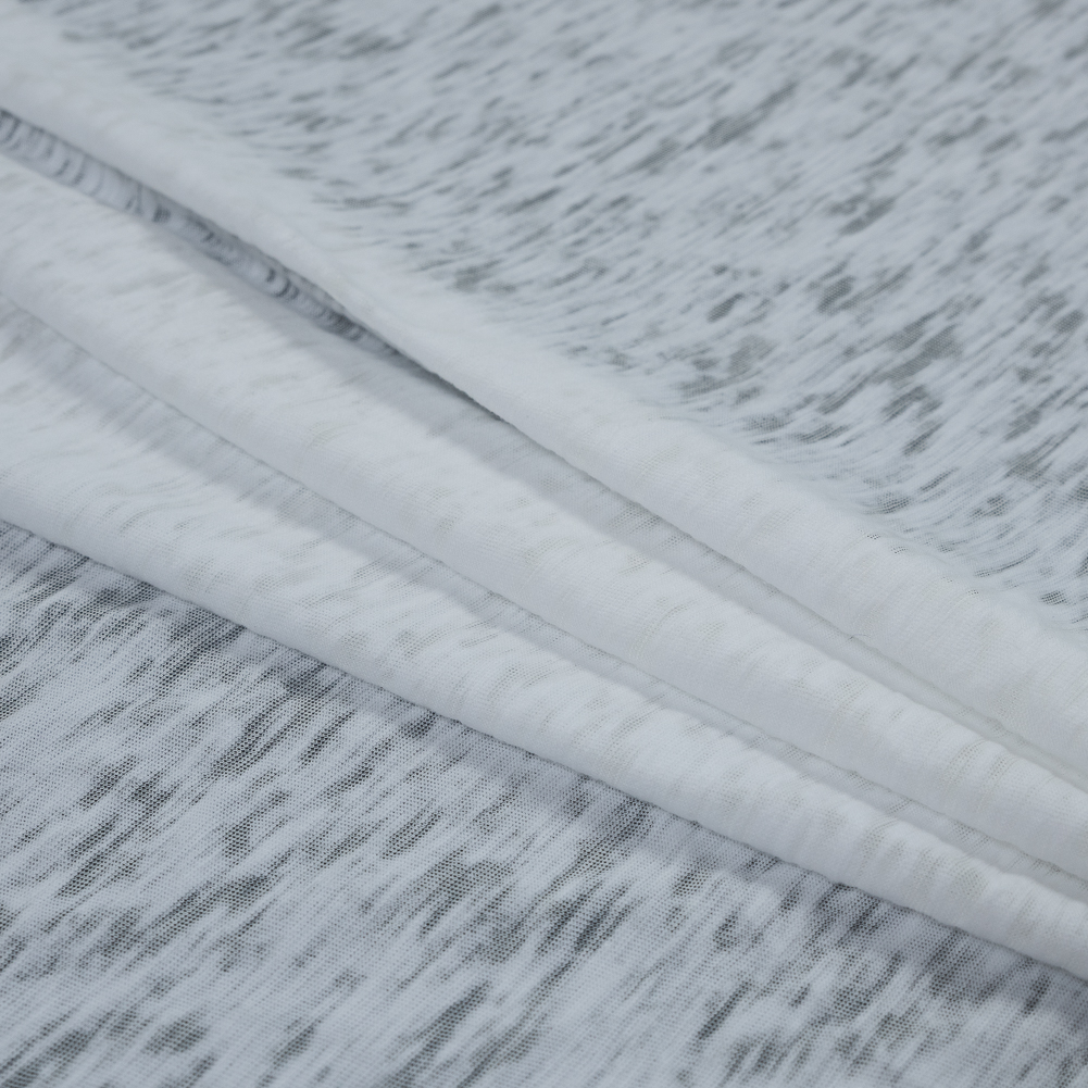 Your basics just got a whole lot cozier! Let this White Cotton and Polyester Burnout Jersey create your next favorite tee, tank or dress! The ultra soft knit features a striated burnout design giving pattern to an otherwise solid white jersey. It has a relaxed drape and 4-way stretch to add to the comfort of your piece as well. Keep it sheer or layer it for more opacity.