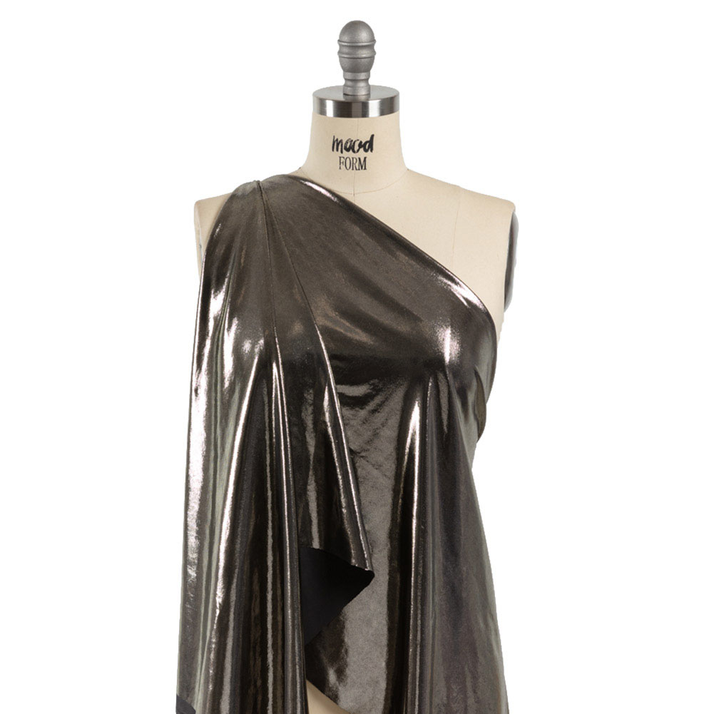 Let your personality shine with this White Gold Tiny Dots Foiled Stretch Polyester Jersey. Light bounces off of the sleek pale gold dots, covering the black jersey, like moonlight shining on wet grains of sand. This fabric is luxurious; the drape falls fluidly, the back is remarkably smooth, and the face is mesmerizingly lustrous. Leggings, bodycon dresses, and bralettes maximize the 50% weftwise stretch, welcoming movement and dance into your agenda with ease.