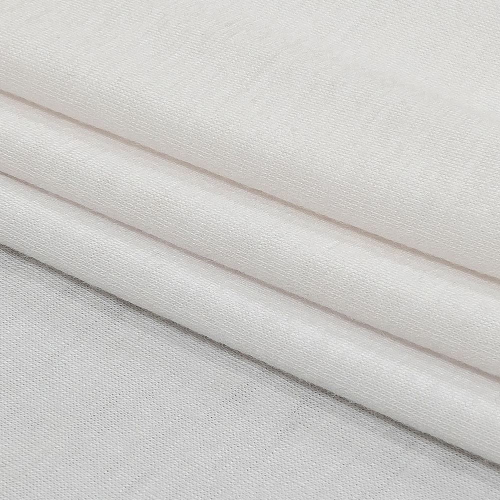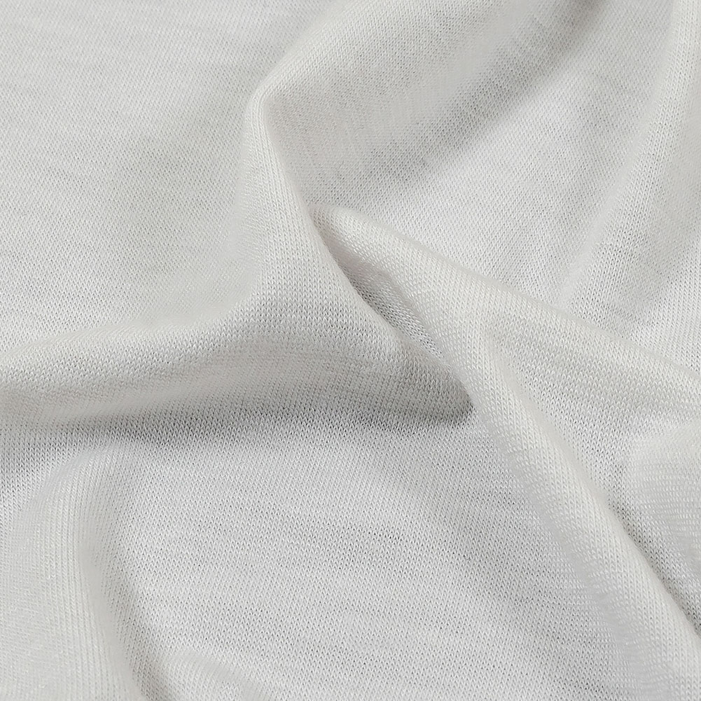 Grab this White Polyester Jersey if versatility and comfort are paramount! With a soft, cool feel, 35% widthwise stretch, and lightweight, fluid drape, it’s perfect for all knitwear basics.
