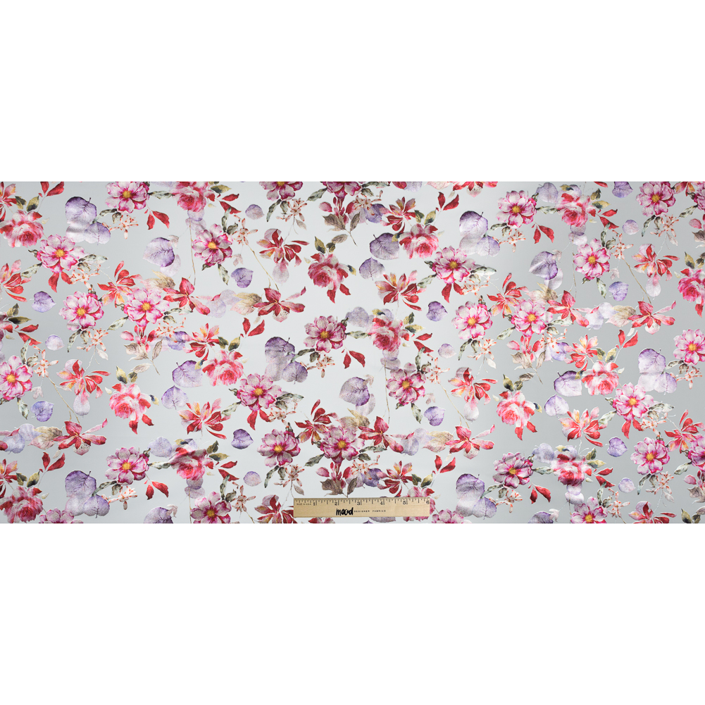 With a contemporary romantic aesthetic, this White Ponte Knit featuring a Red Floral Foil Design is one to add to your collection. Shimmering pink, purple and red flowers bloom across a smooth ponte knit. A 4-way stretch combines with a flexible drape to create overall versatility. Thin with a medium weight, create peplum tops and garden party dresses for spring and summer. Note that it is translucent when stretched.