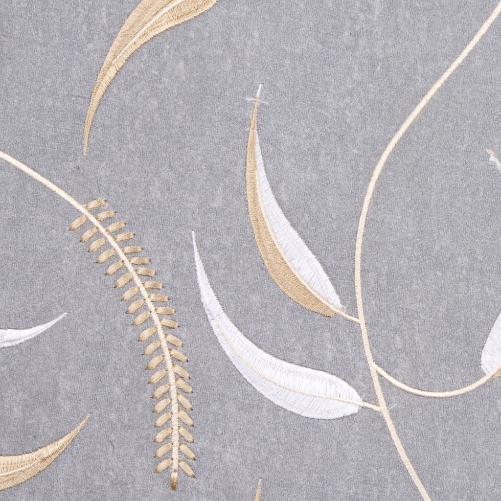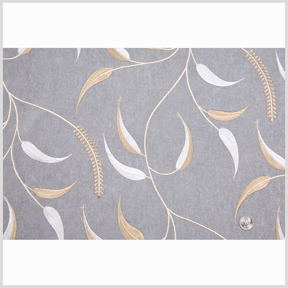 This is a polyester white organza. Has bronze and soft Gray leaves connected by cream stems. Sheer, great for drapery.