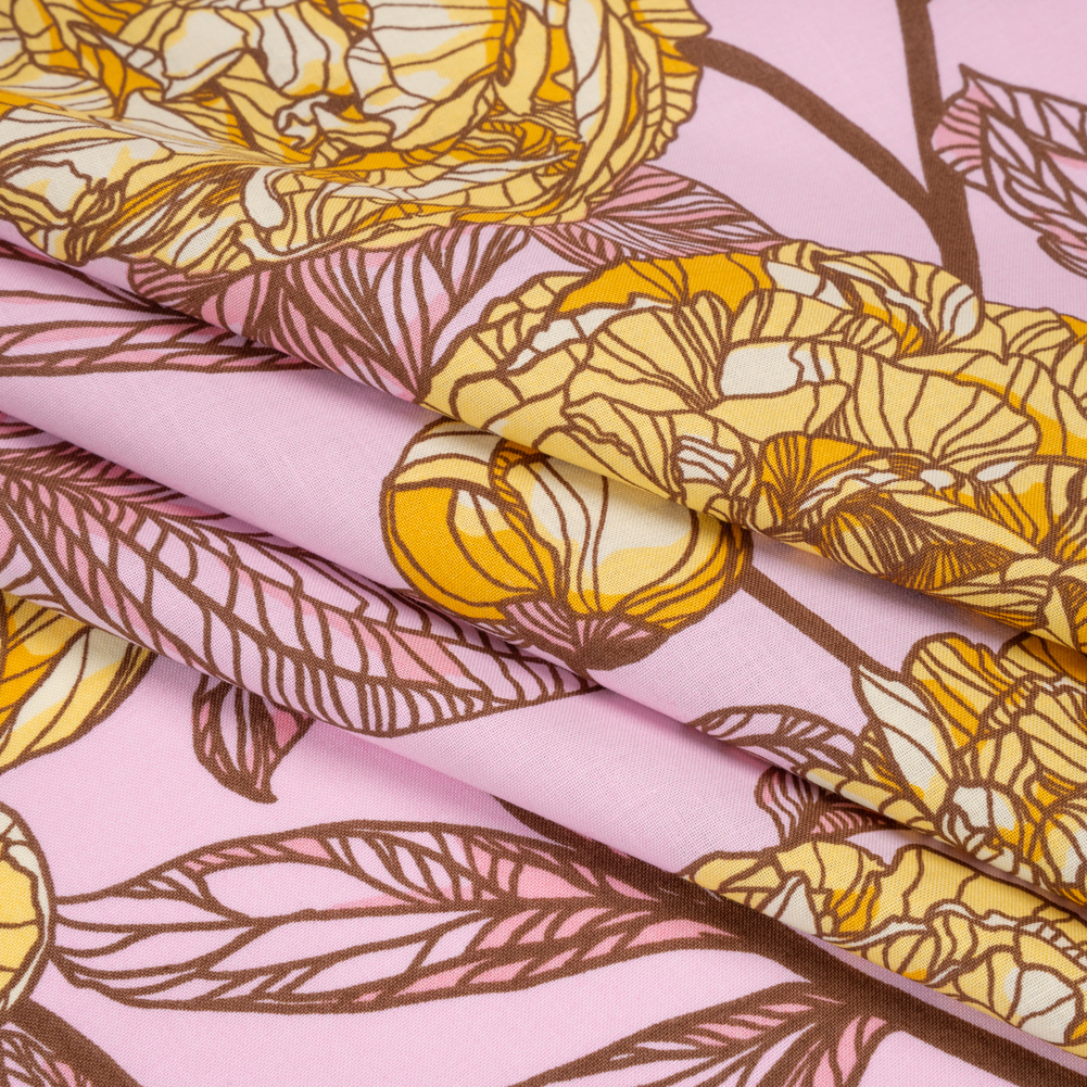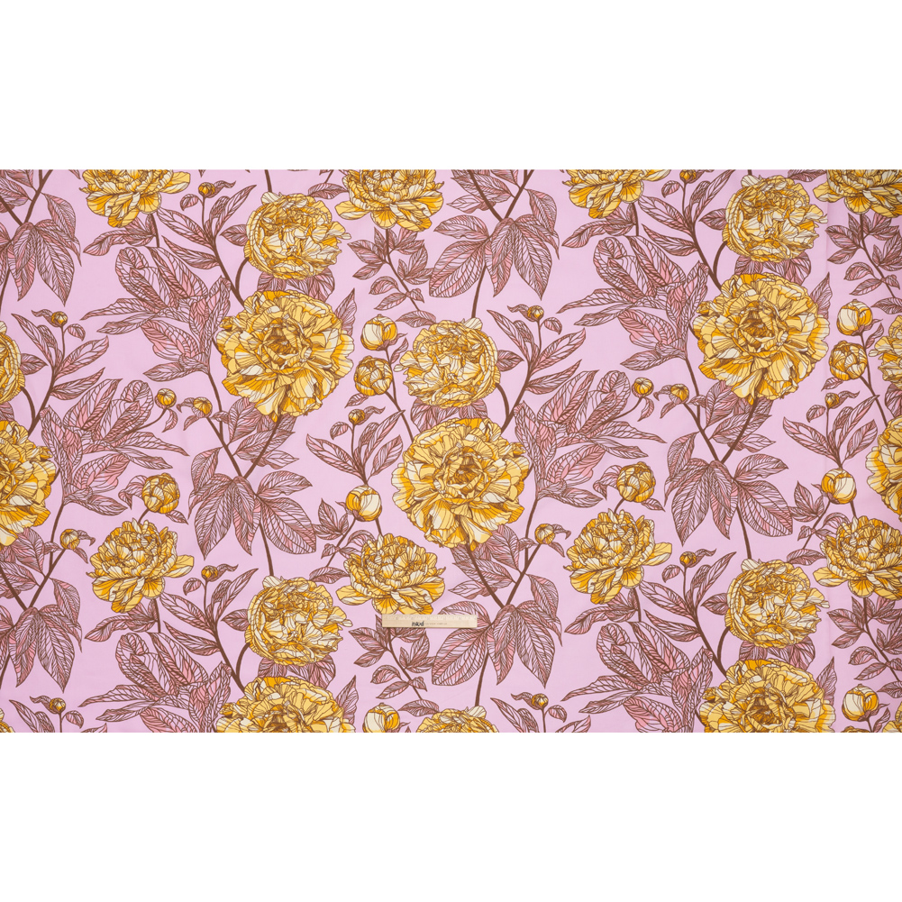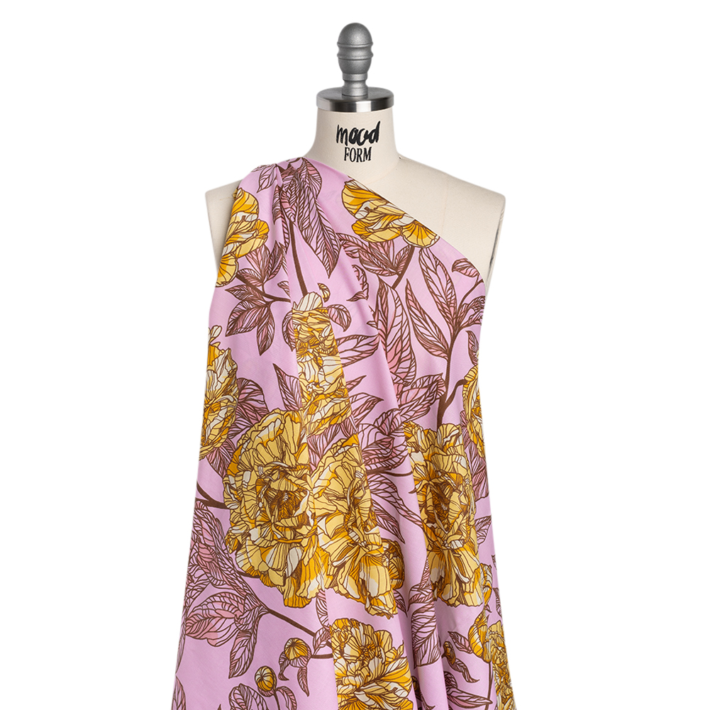 This Sunshine Peony Floral 108” Wide Quilting Cotton by Anna Maria Textiles brings the brilliance of a summer garden to every stitch—featuring a wide backing, smooth hand, and supple drape.Suggested Projects: Dresses, Shirts, Jackets, Quilts, Light Home DecorContent: 100% CottonStretch: NoneOpacity: Slightly TranslucentLarge sunshine-yellow peonies burst into bloom across a soft pale pink backdrop, their petals, leaves, and buds delicately outlined in a warm neutral brown—each detail glowing with the gentle romance of a springtime garden at golden hour. With a smooth hand, supple drape, and no stretch, this 108-inch-wide fabric is crafted for intricate quilt work—a stable weave and silky finish are perfect for anything from classic piecework and wholecloth quilting to appliqués and art quilts to English paper piecing—yet it effortlessly lends itself to lightweight home décor, craft, and fashion projects, too. Plus, the extra-wide width is perfect for backing bed-size quilts with ease, no piecing required.Whether you’re sewing delicate shift dresses, vintage-inspired patchwork skirts, or crisp button-downs and tailored shorts, this fabric evokes the easy charm of vineyard strolls and sun-dappled wine tastings. Light and elegant, it captures the essence of a breezy spring afternoon—its slight translucence best complemented by a lining for added opacity and a refined, graceful finish.