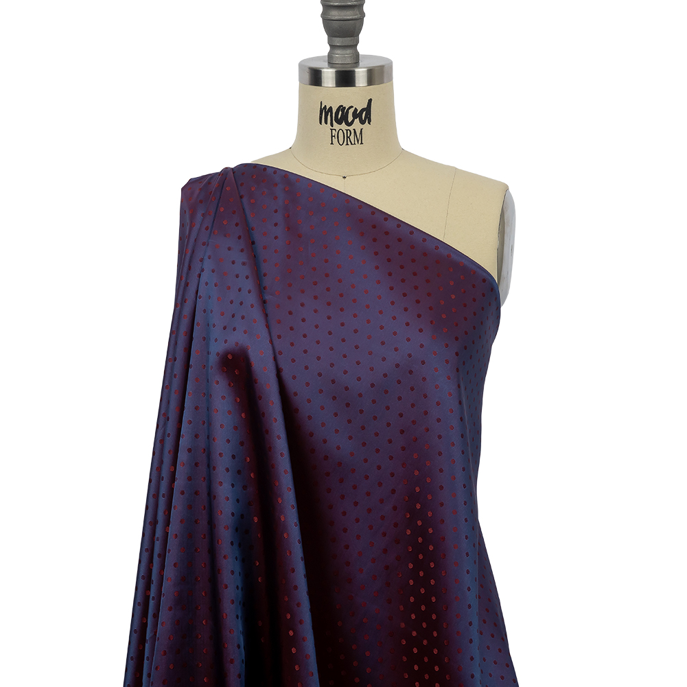This Wine and Blue Bi-Color Polkadots Jacquard Lining will wine and dine its way into your heart. Wine red and royal blue intertwine in a jacquard weave to form a splash of tonal polka dots atop an iridescent-looking ground. With a flexible drape and slick, cool hand, pair this lining with any number of fashion fabrics for a statement look. Line everything from pea and trench coats to cloaks and capes to blazers, jackets, and even dresses and skirts! Slightly translucent, this thin material is best paired with a fashion fabric for a fully opaque finish.