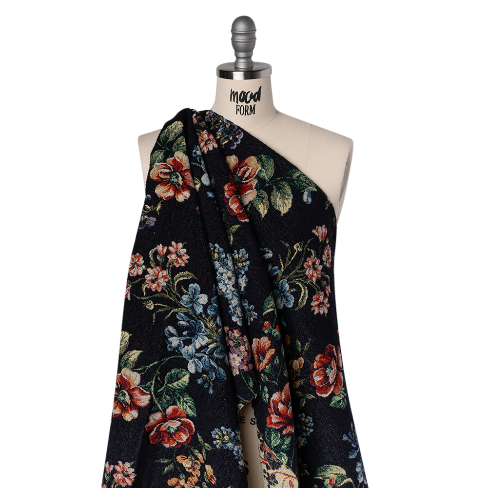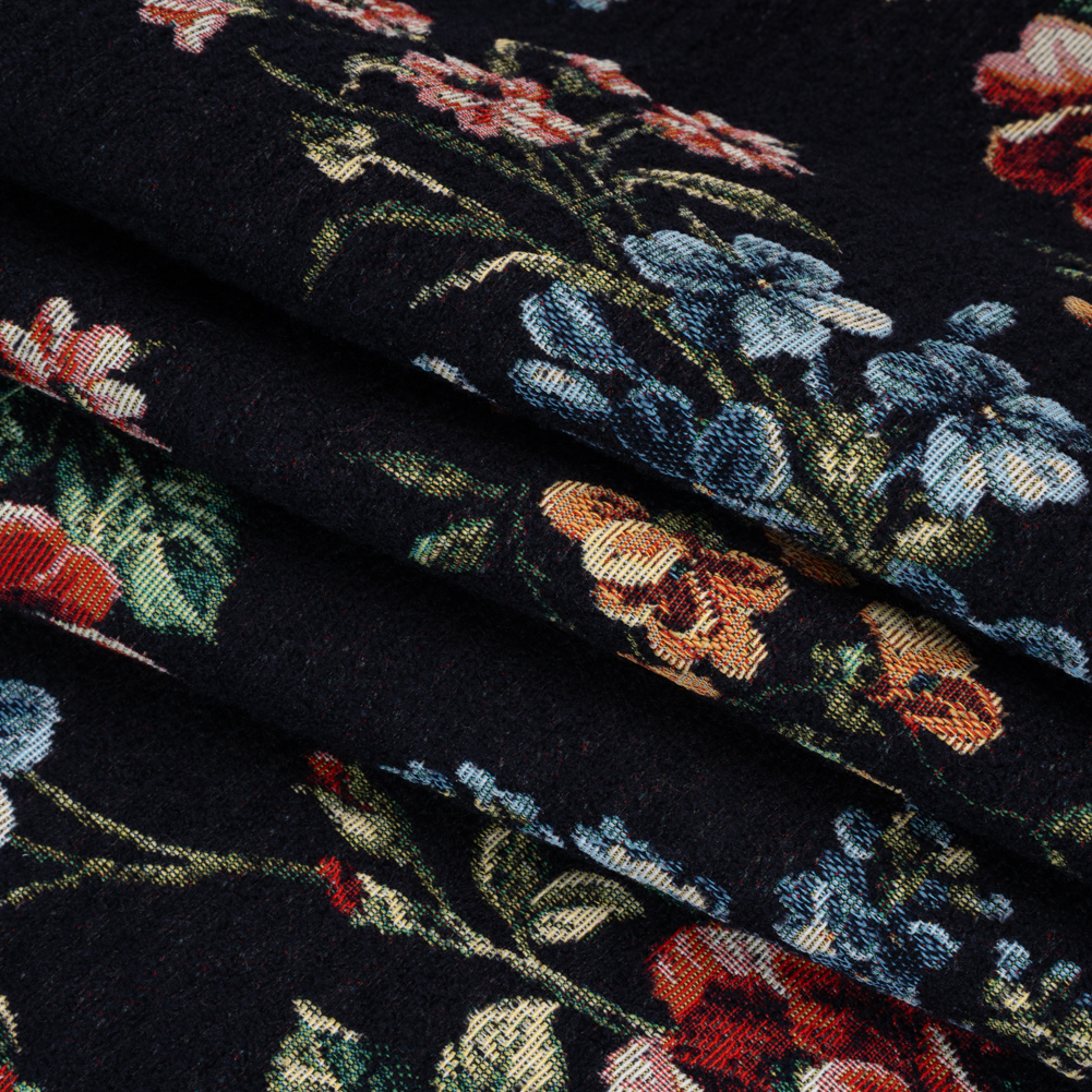 Let your stitches bloom and climb across this Classic Florals Wool and Polyamide Boucle Jacquard—featuring a soft, tactile hand and supple, billowing drape.Suggested Projects: Coats, Jackets, Skirts, DressesContent: 80% Wool, 20% PolyamideStretch: NoneOpacity: OpaqueVibrant red, blue, purple, and orange flowers blossom across a black ground in this boucle jacquard, their beauty enhanced by the fabric’s textured weave. With a soft hand and supple, billowing drape, it’s an ideal choice for autumn coats, structured jackets, pocketed A-line skirts, button-up dresses, and beyond. Fully opaque, it benefits from a lining to add structure and a refined, luxurious finish.