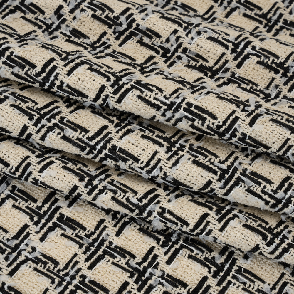 It’s never hounds-too-th late to pick up this Ivory and Black Houndstooth Wool Blend Boucle Tweed—featuring a soft, tactile hand and supple drape.Suggested Projects: Coats, Dresses, Jackets, SkirtsContent: Acrylic, WoolStretch: NoneOpacity: Slightly TranslucentA tactile daydream alights up this tweedy boucle woven in an ivory and black houndstooth design. Bouclé delivers, as always, looped yarn and a soft hand, bringing dimension to your semi-casual and formal wardrobes. It features a supple drape and a soft, tactile hand, perfect for dressing up with Chanel-inspired coats or dressing down with chunky ponchos. Slightly translucent, we suggest a lining for increased opacity, structure, and warmth.
