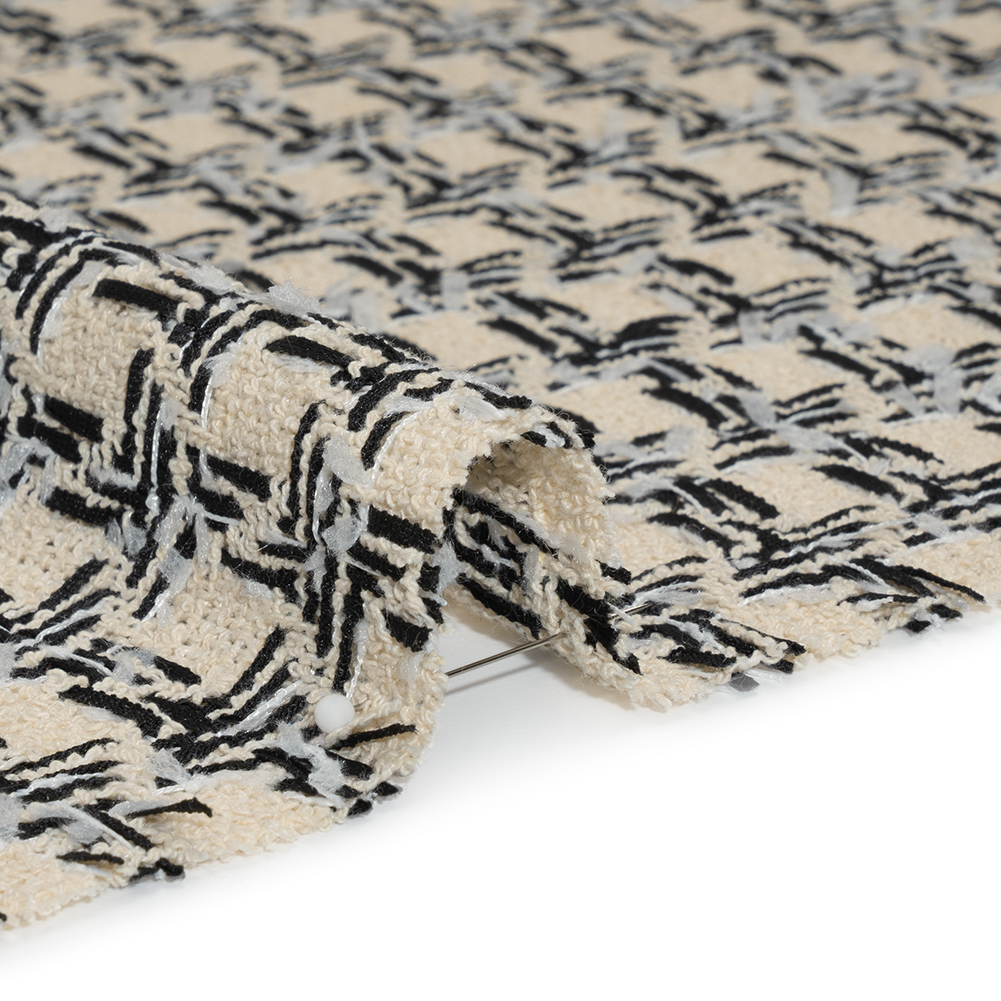 It’s never hounds-too-th late to pick up this Ivory and Black Houndstooth Wool Blend Boucle Tweed—featuring a soft, tactile hand and supple drape.