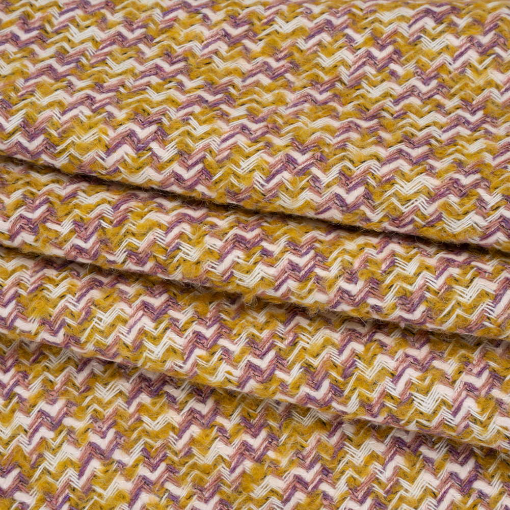 Squeeze some flavor into your designs with this Mustard Yellow, White and Light Purple Wool Blend Tweed Twill—featuring a soft, fuzzy hand and supple drape.Suggested Projects: Jackets, Pants, Skirts, DressesContent: 60% Wool, 20% Polyamide, 18% Polyester, 2% LurexStretch: NoneOpacity: Mostly OpaqueMustard yellow, white, and light purple threads interlace in a lively zigzag pattern, bringing playful energy and texture to this fabric. A twill weave lends this wool-blend tweed both softness and dimension, making it a versatile choice for casual and formal wardrobes alike. With its supple drape, it’s ideal for crafting statement button-up coats to weather the autumn chill, playful suit sets for afternoon outings, or even cozy shawls for fireside layering. Mostly opaque, it pairs best with a lining to enhance comfort, warmth, and coverage.