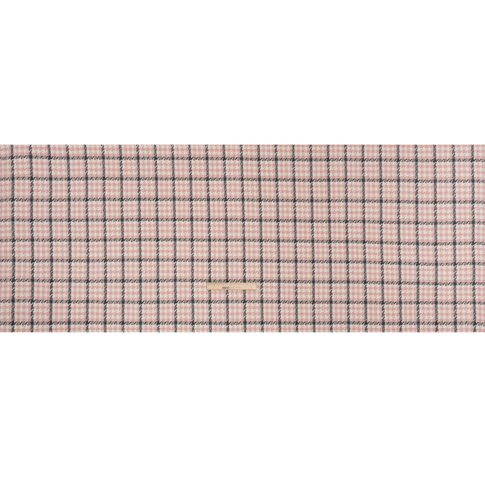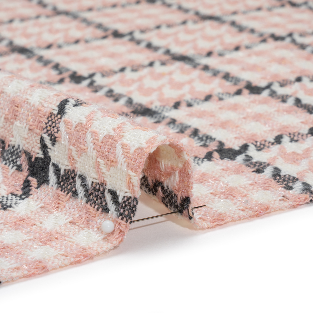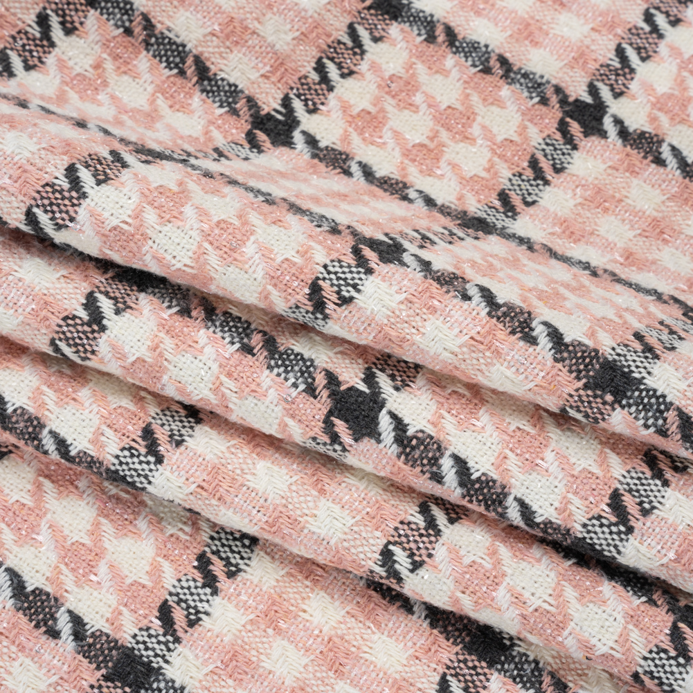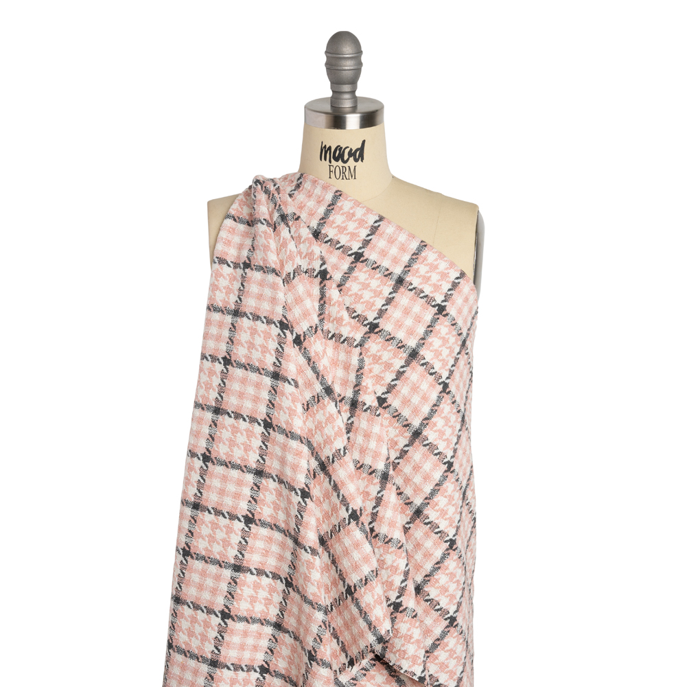 This Houndstooth Plaid Wool Blend Tweed is sure to plaid-er you. Featuring a clear eyelash fringe and baby sequins, its tactile hand and supple drape are the ideal choice for truly regal businesswear.Suggested Projects: Dresses, Jackets, Suit Sets, CoatsContent: Wool, Acrylic, LurexStretch: NoneOpacity: Mostly OpaqueLadies, or gentlemen, who lunch can luxuriate in the feel of this wool blend tweed. Tweed is often seen on runways or at high-profile events as its famously dimensional face and nubby texture create statement pieces for every age, gender, and period. In this case, charcoal, rose pink, and cream threads weave together to create a houndstooth plaid design—interspersed occasionally with clear eyelash fringe and baby sequins for a bit of luster and sparkle. It features a supple drape and tactile hand, ideal for Chanel-inspired jackets, chic blazers with matching pencil skirts, and belted coats.