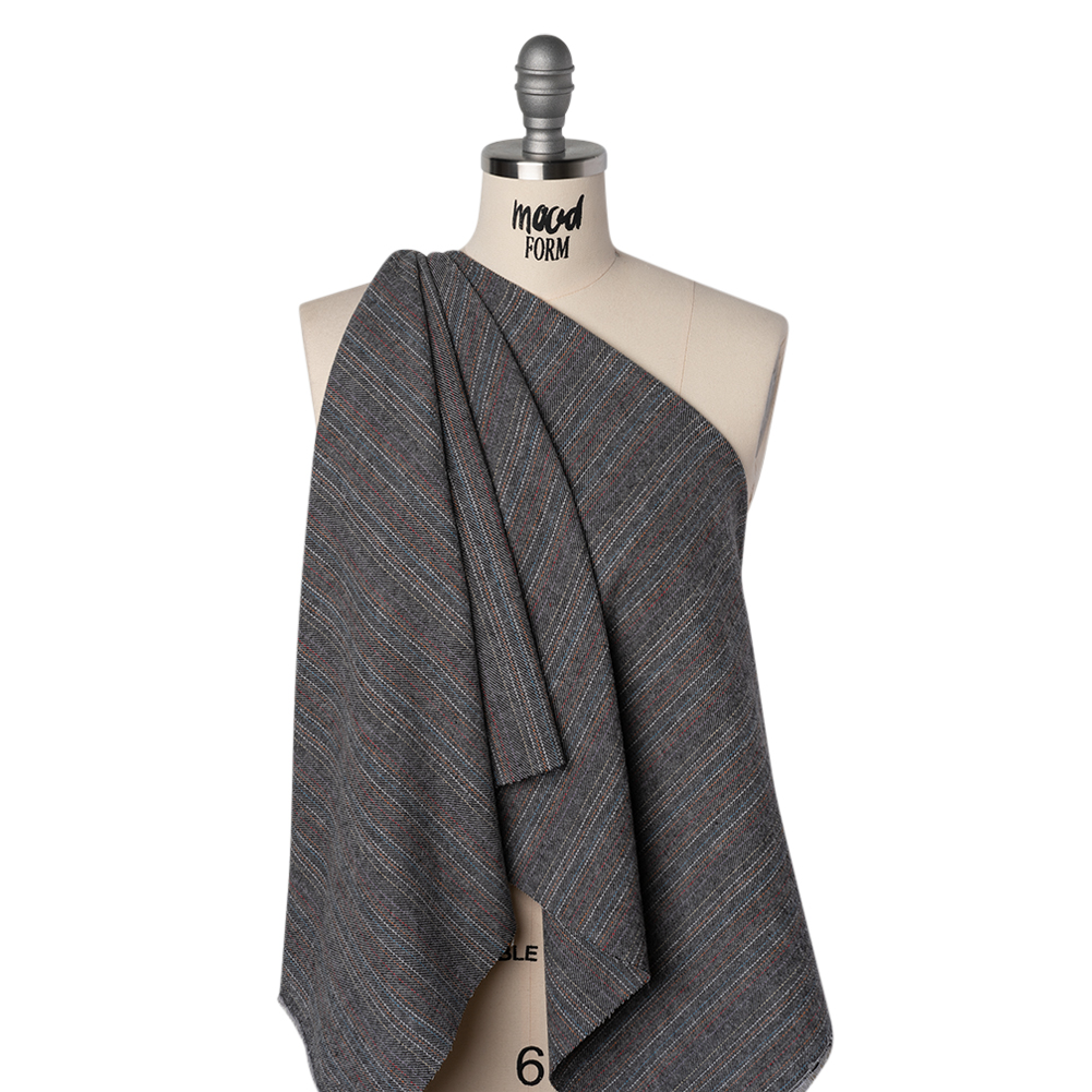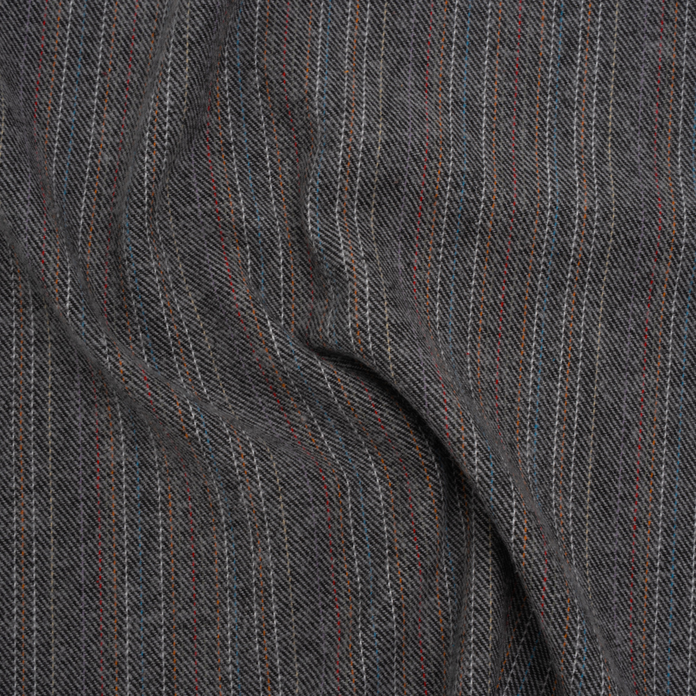 Infuse your projects with delicate color using this Pinstriped Yarn-Dyed Cotton Twill Flannel—featuring an ultra-soft hand and supple drape.Suggested Projects: Lightweight Jackets, Shirts, Dresses, SkirtsContent: 100% CottonStretch: NoneOpacity: OpaqueGray and black threads form a subtle striped ground, brought to life with fine pinstripes of sky blue, red, yellow, and white. With a 100% cotton composition, this fabric underwent a brushed finishing technique, resulting in a fuzzy face and elevating the already soft qualities of flannel. Its medium-weight and supple drape are perfect for a range of sewing projects: comfortably create button-up shirts, wrap-around dresses, structured cardigans, and other cold-weather garments. Mostly opaque, a lining isn’t necessary but may be added for increased structure and opacity.