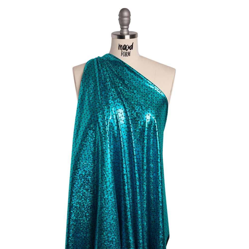 Bright designs with this Fish Scale Holographic Foiled Stretch Polyester Jersey by Yaya Han flow in like bioluminescent tides—featuring a sleek hand and flexible drape.Suggested Projects: Skirts, Pants, Jackets, CostumesContent: 94% Polyester, 6% SpandexStretch: 25% All-WayOpacity: TranslucentShimmering metallic turquoise fish scales ripple across a black background, evoking visions of underwater realms and fantastical adventures. Designed with cosplayers in mind, this fabric features a dazzling foiled fish scale finish and a 25% all-way stretch—perfect for crafting mermaid tails, aquatic-inspired costumes, or adding a splash of magic to your designs. With a sleek hand and flexible drape, it effortlessly transforms into body-hugging skirts, pants, jackets, and bold statement pieces. Translucent between the scales, a lining may be added for full opacity but isn’t essential. Whether you're gliding across the convention floor or making waves on stage, this fabric ensures you’ll shine in every spotlight!
