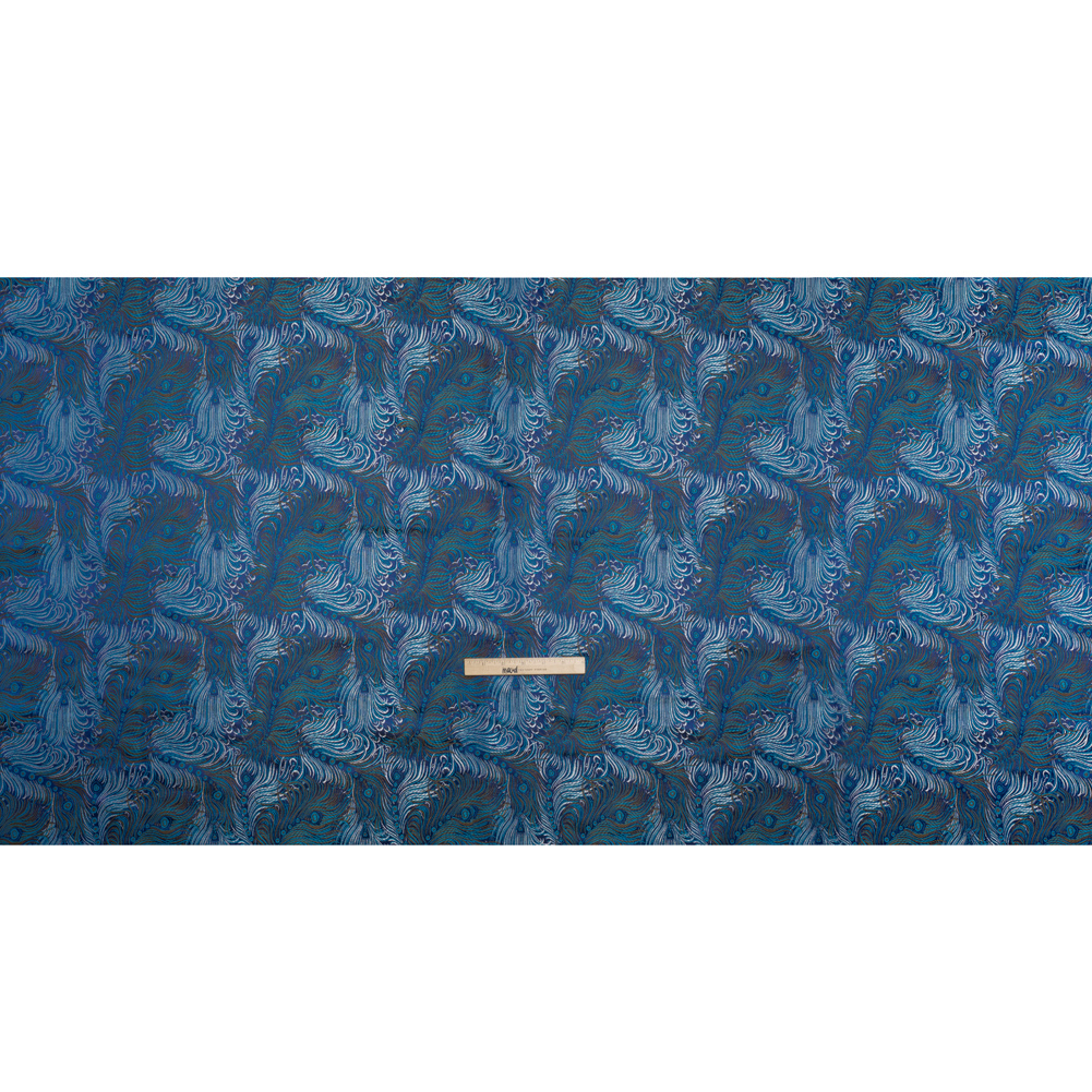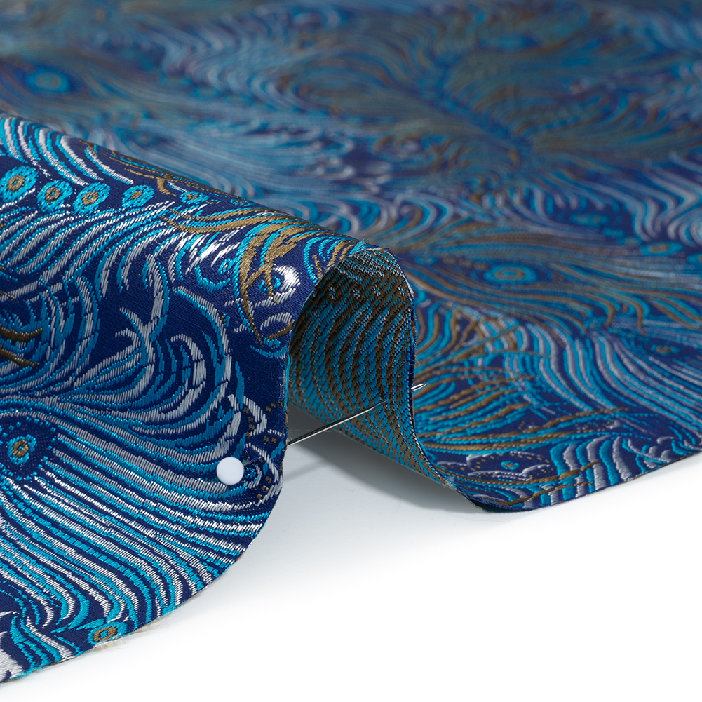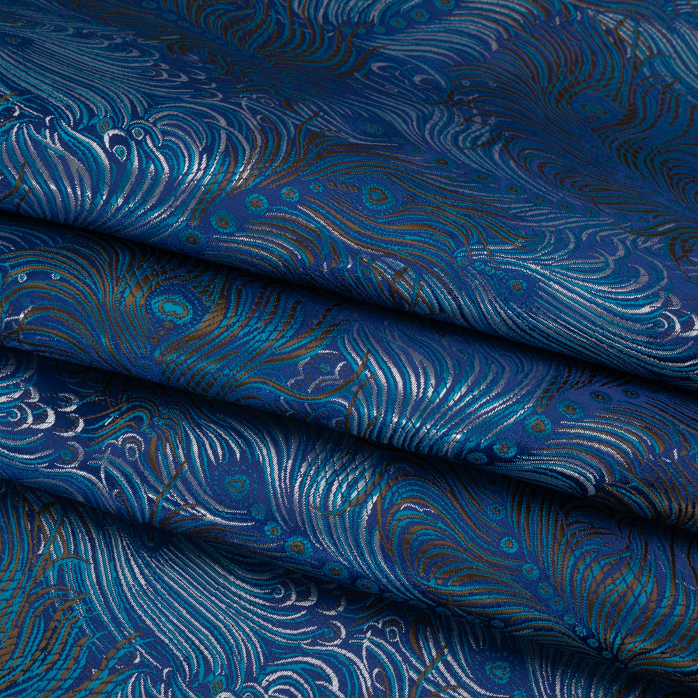 Follow the flow of this Peacock Feather Lustrous Polyester Brocade by Yaya Han to your next design—featuring a sleek hand and slightly structured, voluminous drape.Suggested Projects: Gowns, Skirts, Jackets, AccessoriesContent: 65% Polyester, 35% NylonStretch: NoneOpacity: OpaqueYour next design will take flight with this lustrous polyester brocade by Yaya Han. An intricate peacock feather design unfurls across the navy blue face in hues of sky blue, brown, and white—perfect for crafting royal ensembles or adding a hint of Renaissance charm to your designs. With a sleek hand and a slightly structured, voluminous drape, it effortlessly transforms into billowing gowns, dramatic circle skirts, tailored jackets, and more. Though opaque, a lining can be added for enhanced structure and a polished, elegant finish.