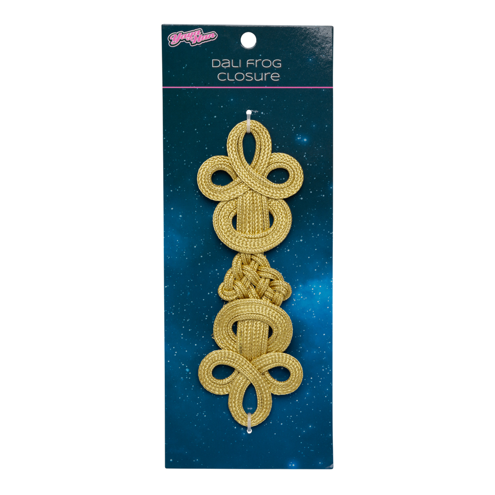 Take your cosplay to extraordinary heights with this Dali Gold Knots Metallic Faux Frog Closure Applique by Yaya Han—featuring a tactile hand and malleable drape.Dimensions: 6.75" x 2.375"Content: 100% PolyesterStretch: NoneTruly exquisite ideas flow out of this Dali gold knot metallic faux frog closure applique by Yaya Han. A fusion of elegance and versatility, this radiant applique weaves fantasy, steampunk, medieval, and historical aesthetics into every stitch. Whether used as a striking jacket closure, a structured neckline detail, or a bold headpiece, its intricate design and gilded finish make it a showstopping addition to your cosplay creations.