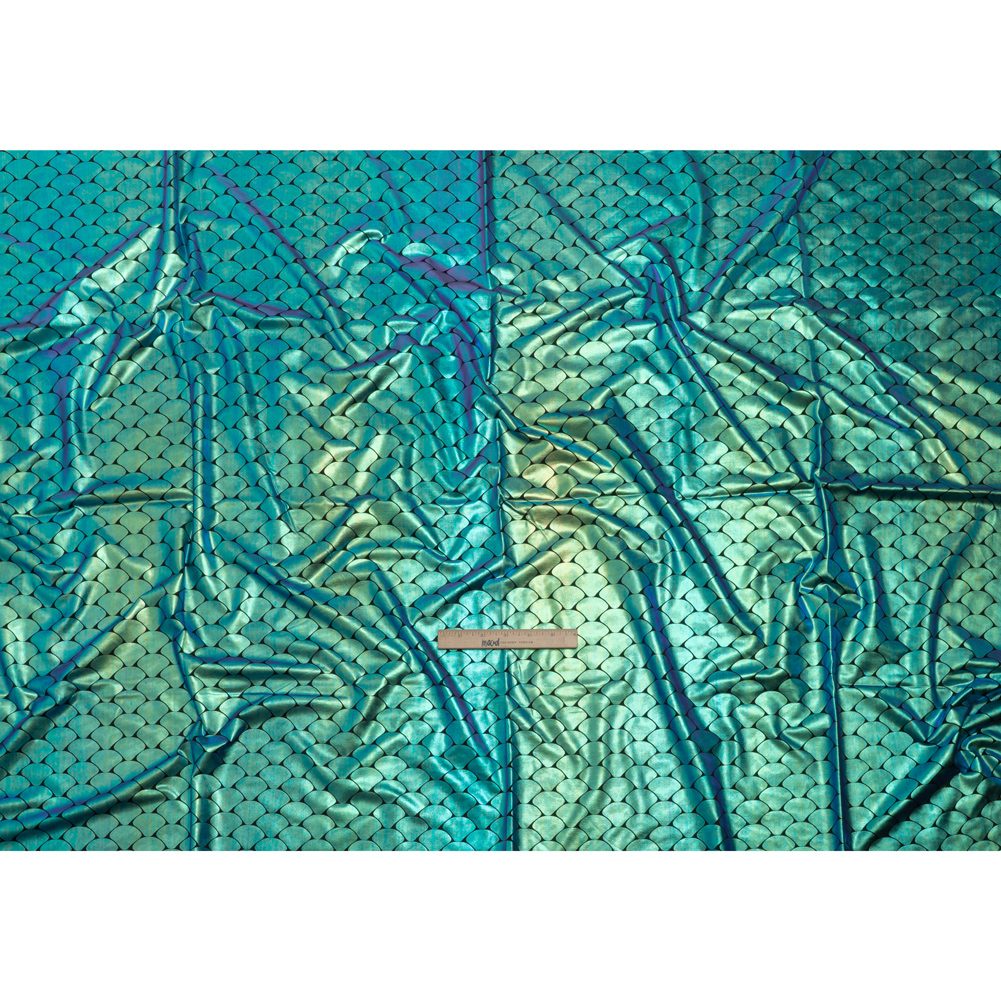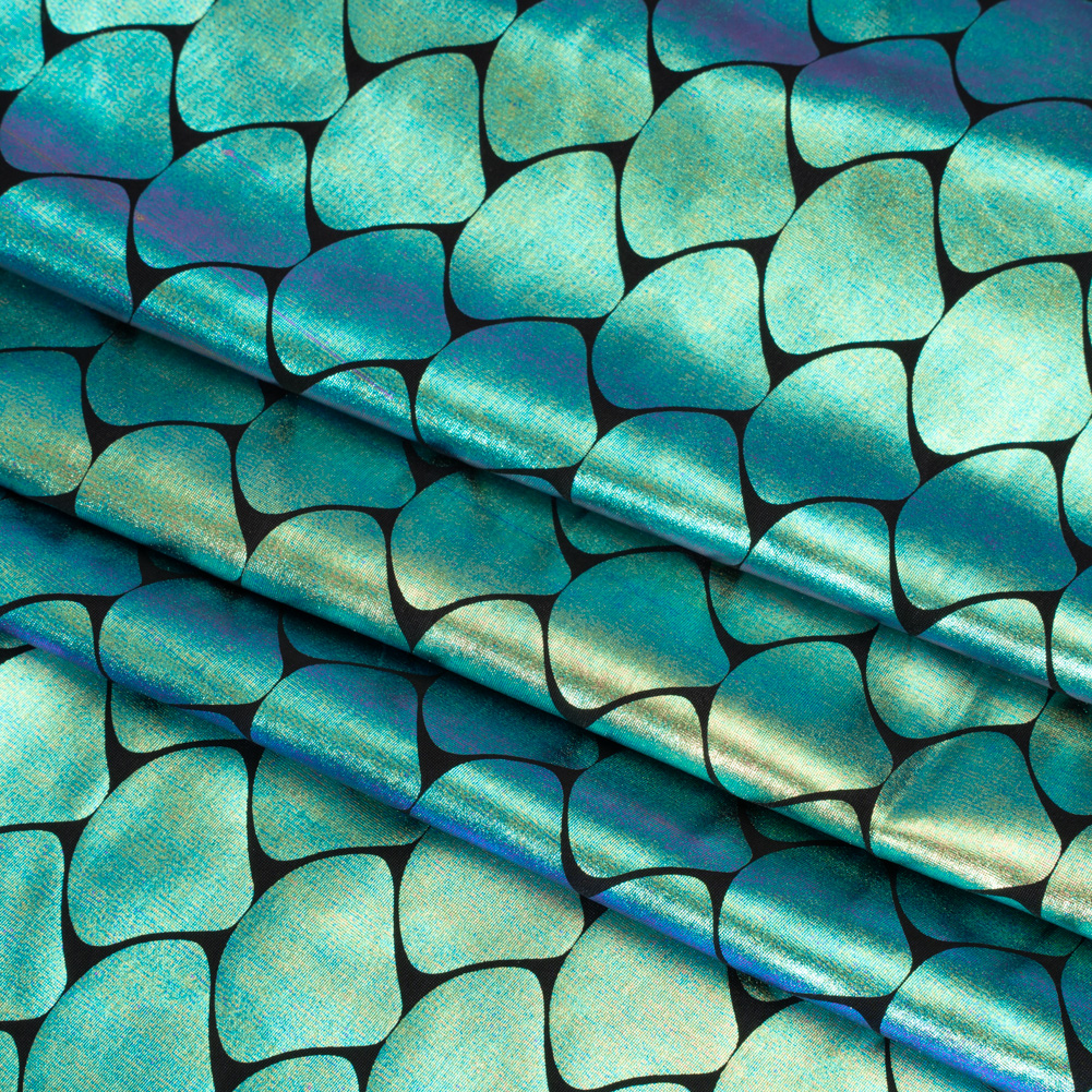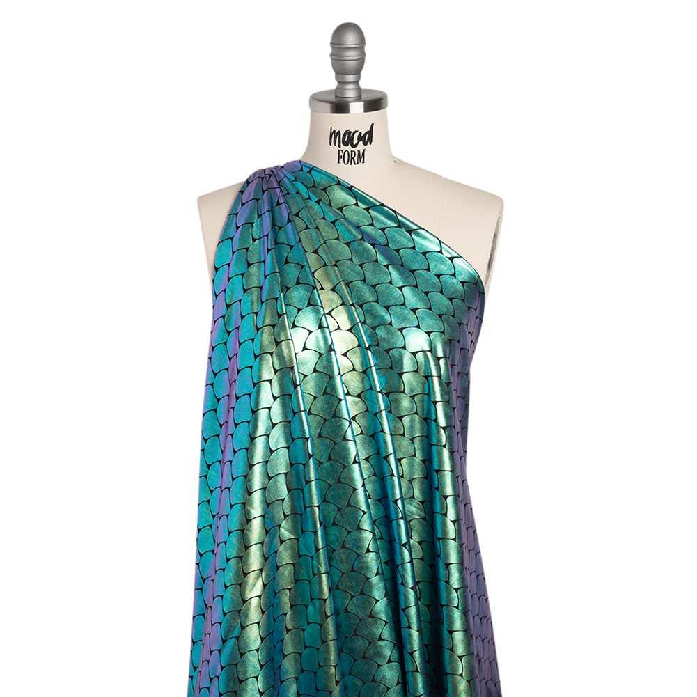 Dive into your next design with this Metallic Foiled Mermaid Fish Scales on Black Stretch Polyester Jersey by Yaya Han—featuring a sleek hand and flexible drape.Suggested Projects: Skirts, Pants, Jackets, CostumesContent: 94% Polyester, 6% SpandexStretch: 50% All-WayOpacity: Slightly TranslucentShimmering aqua blue and purple mermaid scales ripple across a black background, evoking visions of underwater realms and fantastical adventures. Designed with cosplayers in mind, this fabric features a dazzling foiled fish scale finish and a 50% all-way stretch—perfect for crafting mermaid tails, aquatic-inspired costumes, or adding a splash of magic to your designs. With a sleek hand and flexible drape, it effortlessly transforms into body-hugging skirts, pants, jackets, and bold statement pieces. Slightly translucent between the scales, a lining may be added for full opacity but isn’t essential. Whether you're gliding across the convention floor or making waves on stage, this fabric ensures you’ll shine in every spotlight!