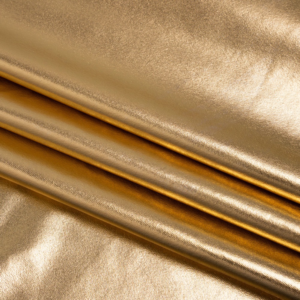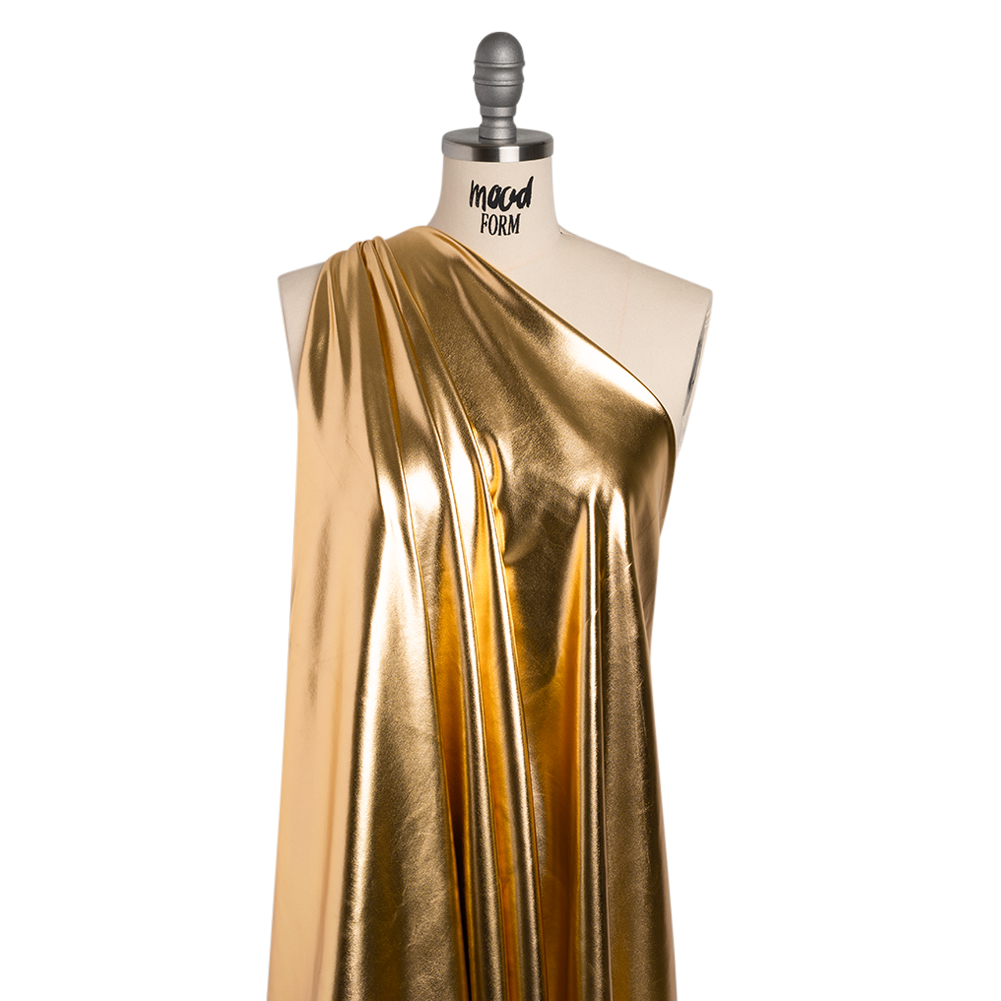 This Bright Gold Metallic Foiled Stretch Polyester Jersey by Yaya Han is worth its weight in gold—featuring a sleek hand and flexible drape.